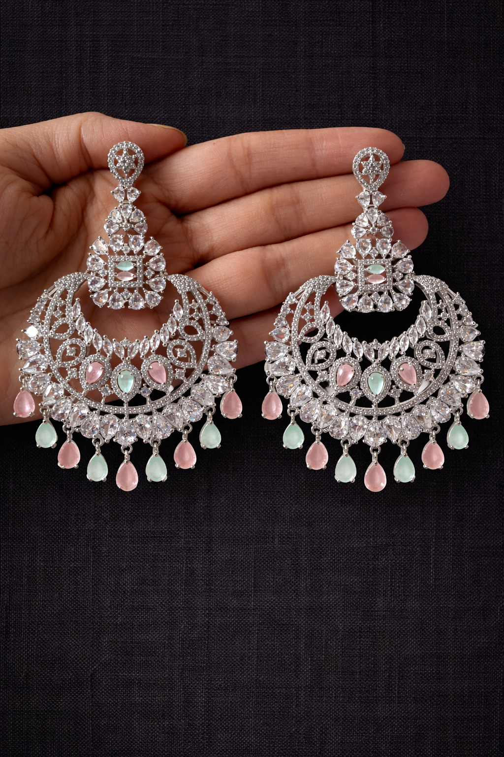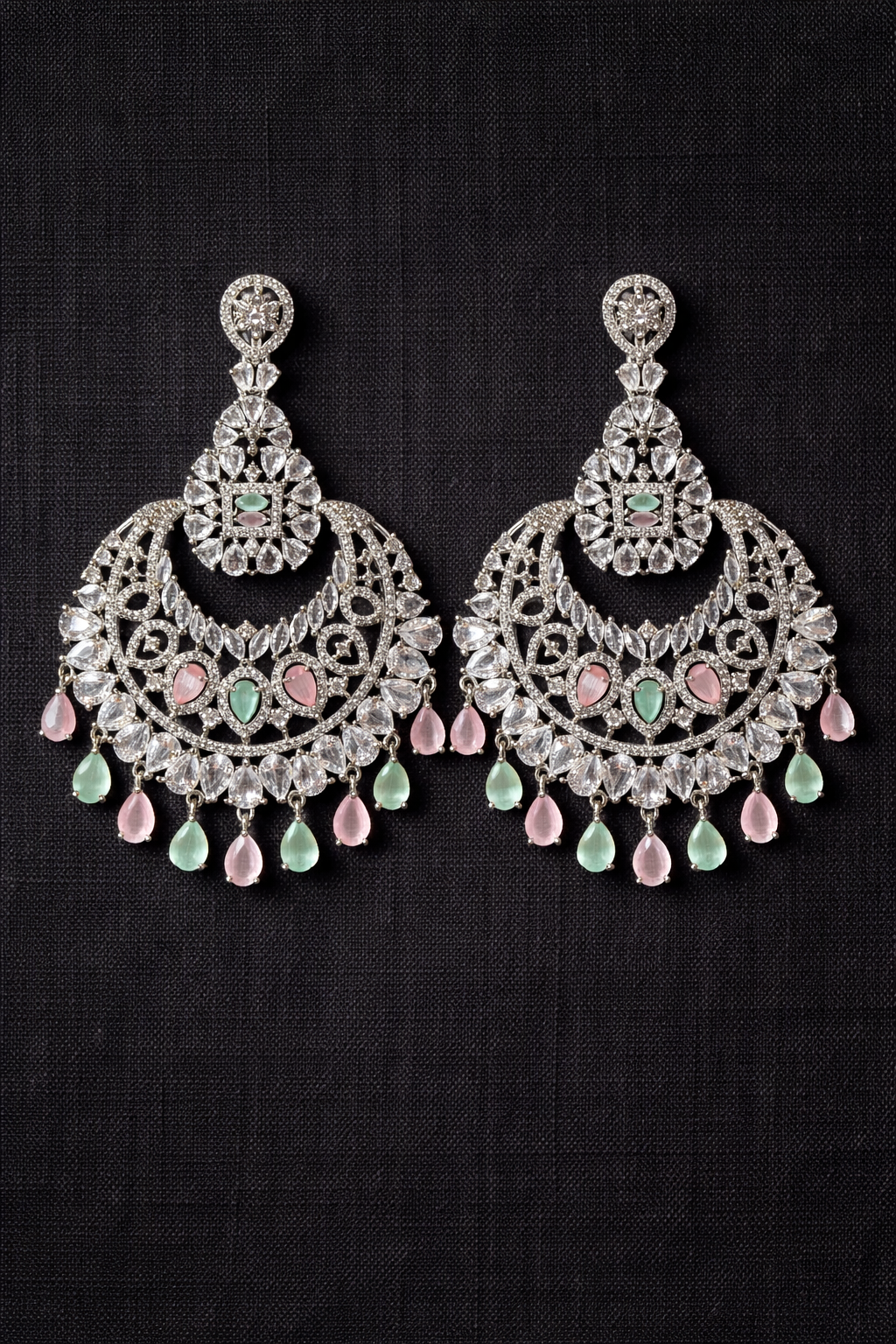 Gracefully handcrafted in a silver-tone finish, the Aarohi Chandra Earrings feature intricate crescent filigree adorned with brilliant white stones and soft pastel pink and mint-green drops. The symmetrical chandelier design blends delicate detailing with a regal Indian aesthetic, making these earrings perfect for festive occasions, weddings, and elegant evening wear.