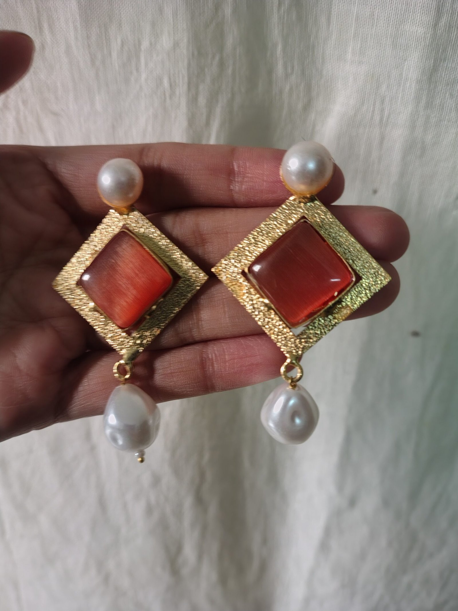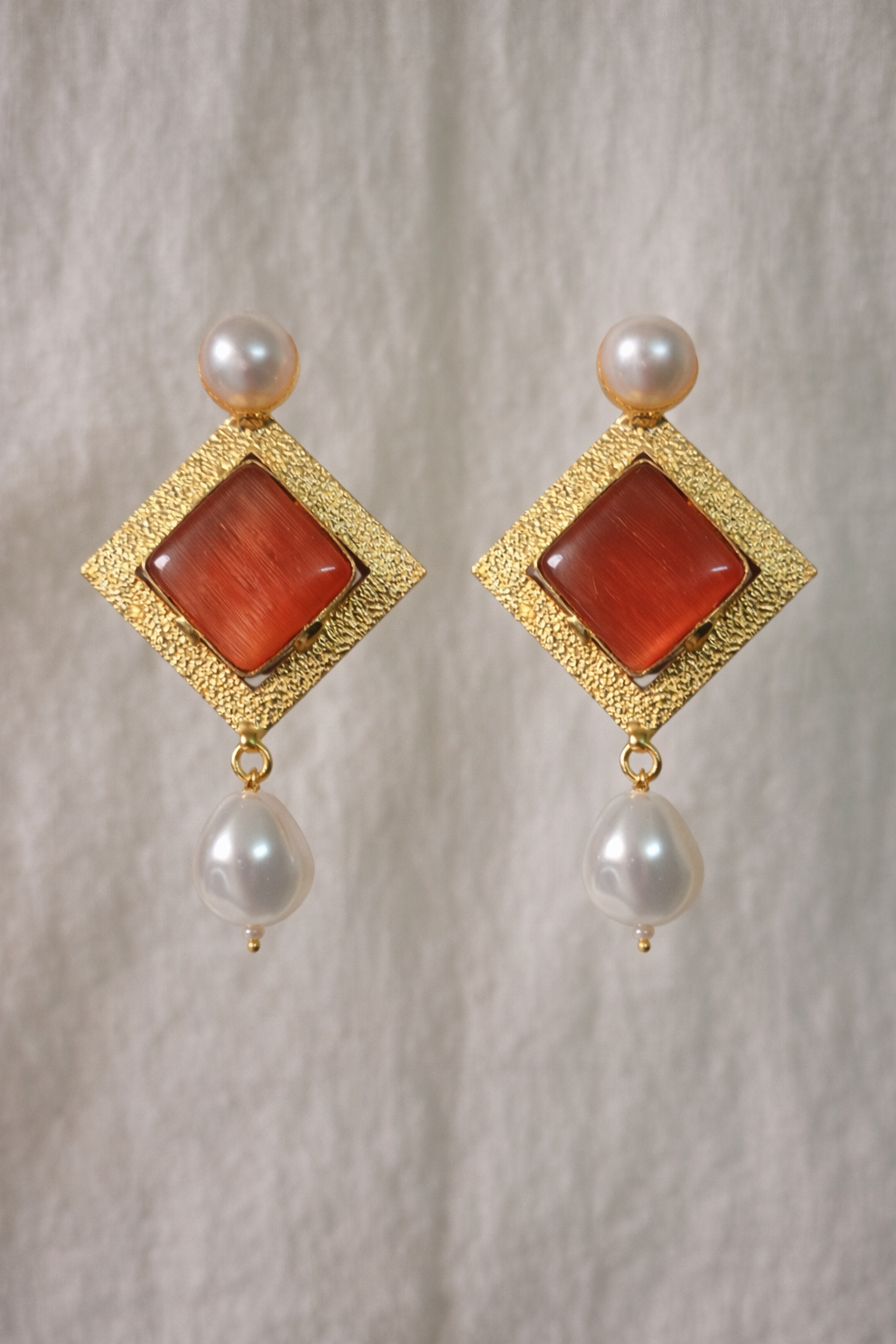 Graceful gold-toned earrings featuring a textured square frame set with warm amber-hued stones, topped and finished with lustrous pearl accents.