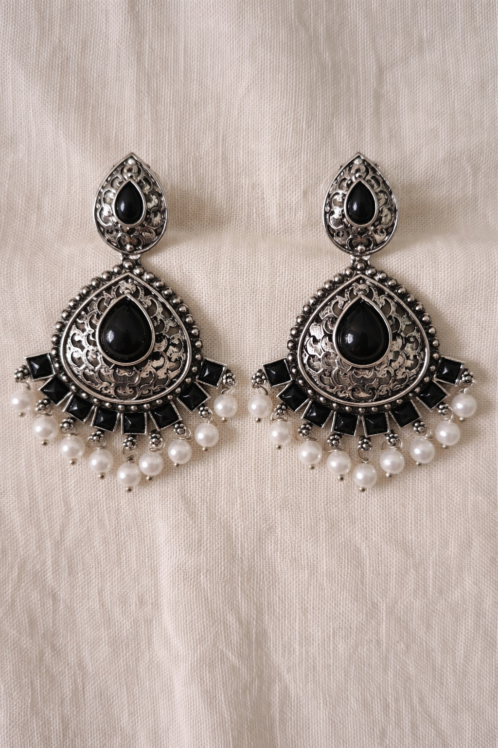 Elegant oxidized silver chandbali earrings featuring deep black teardrop stones set in intricately carved filigree frames.