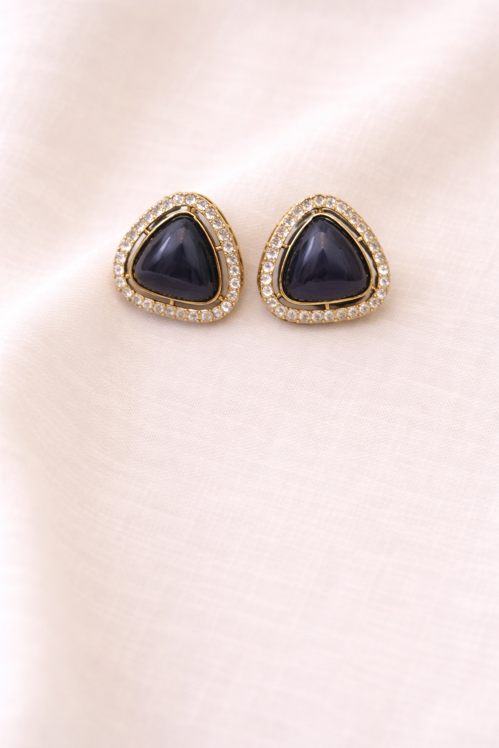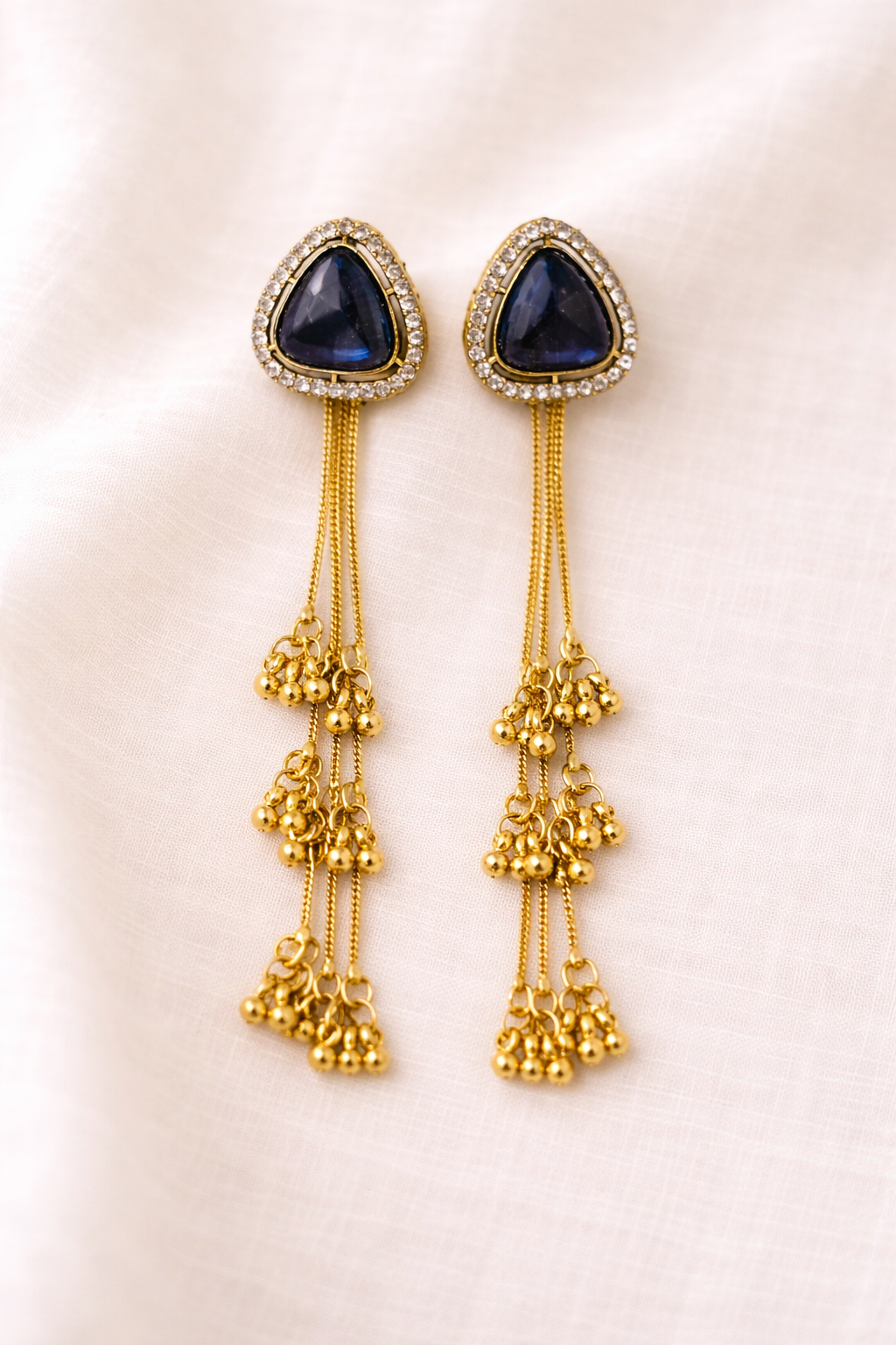 Elegant long drop earrings featuring deep blue transparent stones framed with sparkling accents, finished with cascading gold-toned chains and ghungroo details for graceful movement and a refined festive look.