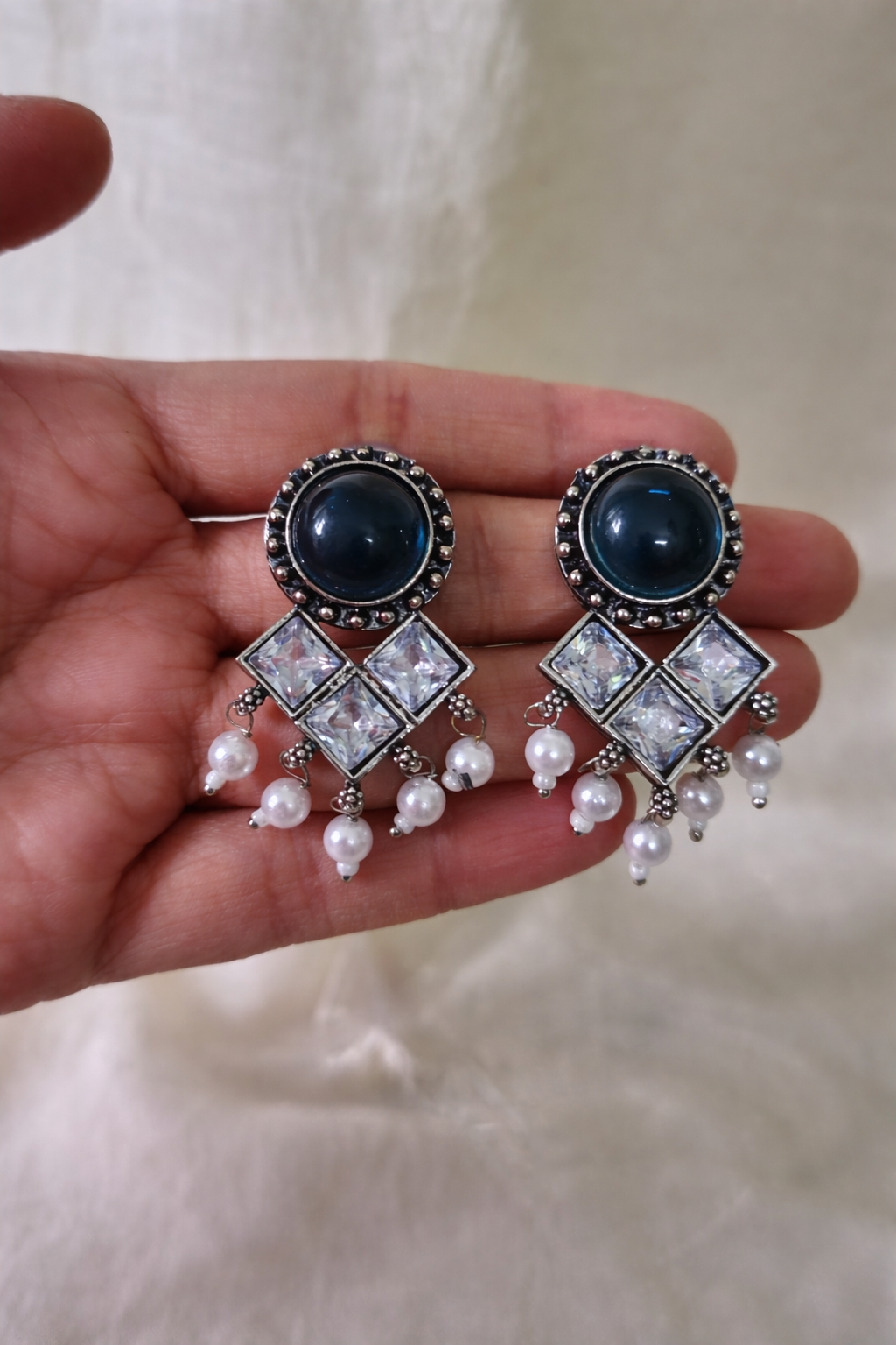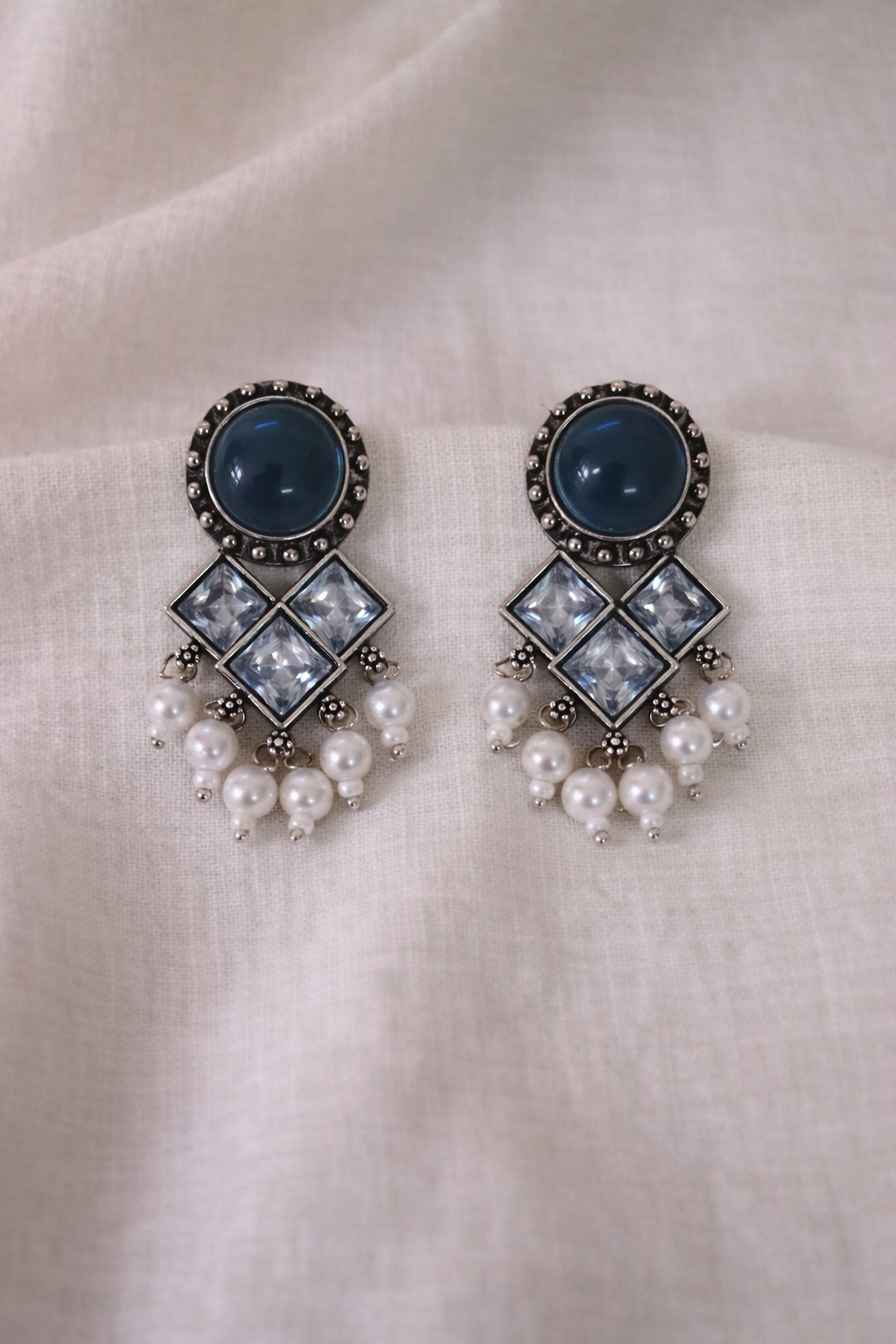Sophisticated silver-tone earrings featuring deep blue cabochon stones, sparkling crystal squares, and delicate pearl drops—perfect for elegant evenings and festive styling.