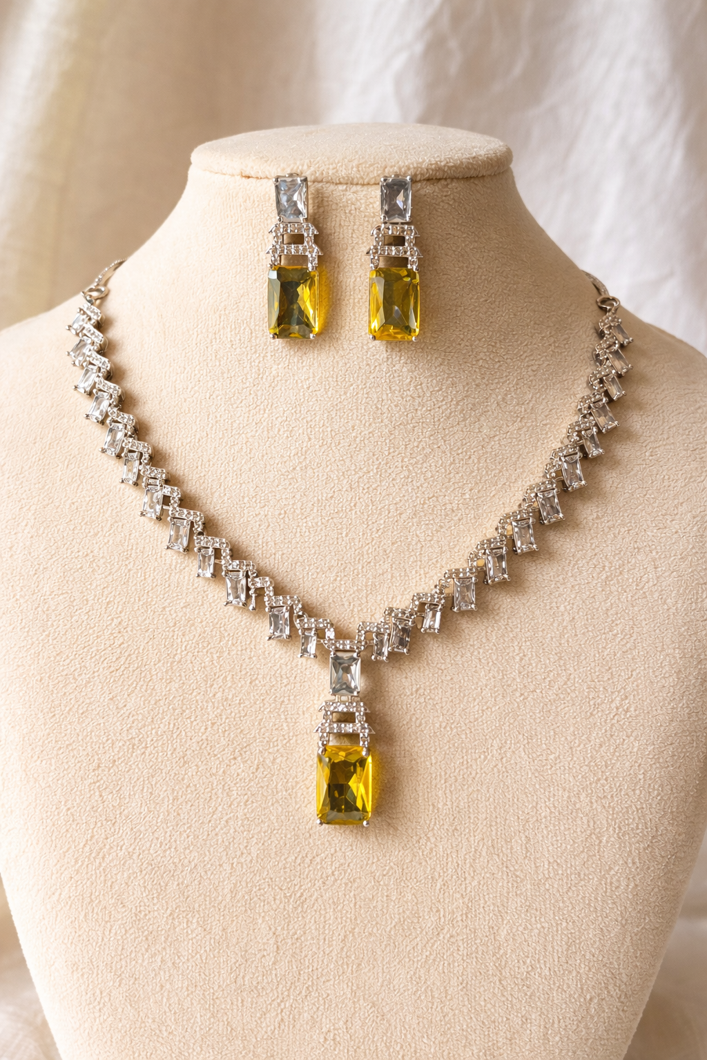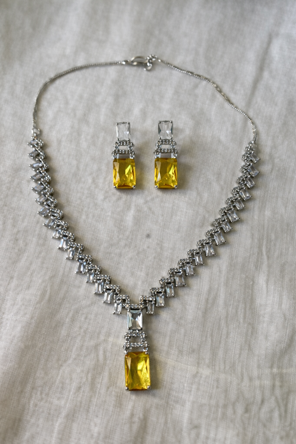 A graceful necklace and earring set crafted in a radiant silver-tone finish, adorned with precision-cut clear stones and striking emerald-cut citrine drops.