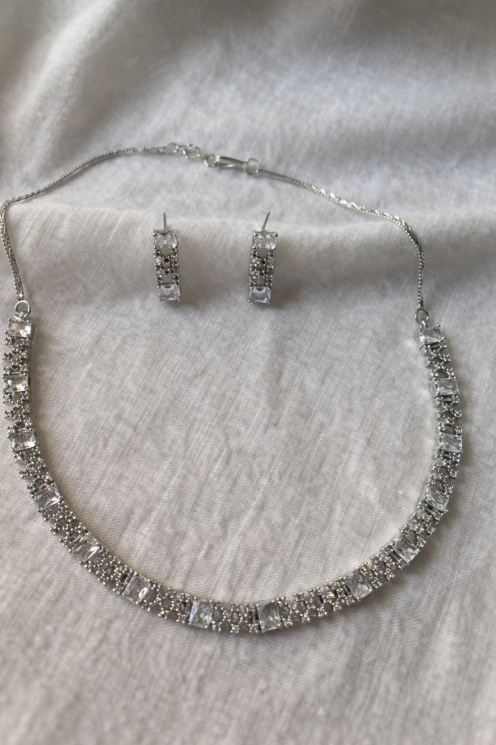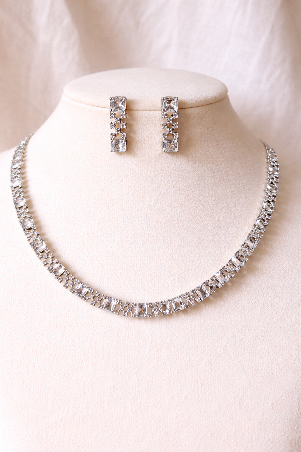 A sleek and modern diamond necklace set featuring emerald-cut stones arranged in a graceful line, paired with matching drop earrings. Perfect for elegant evenings, cocktail events, and contemporary bridal looks.