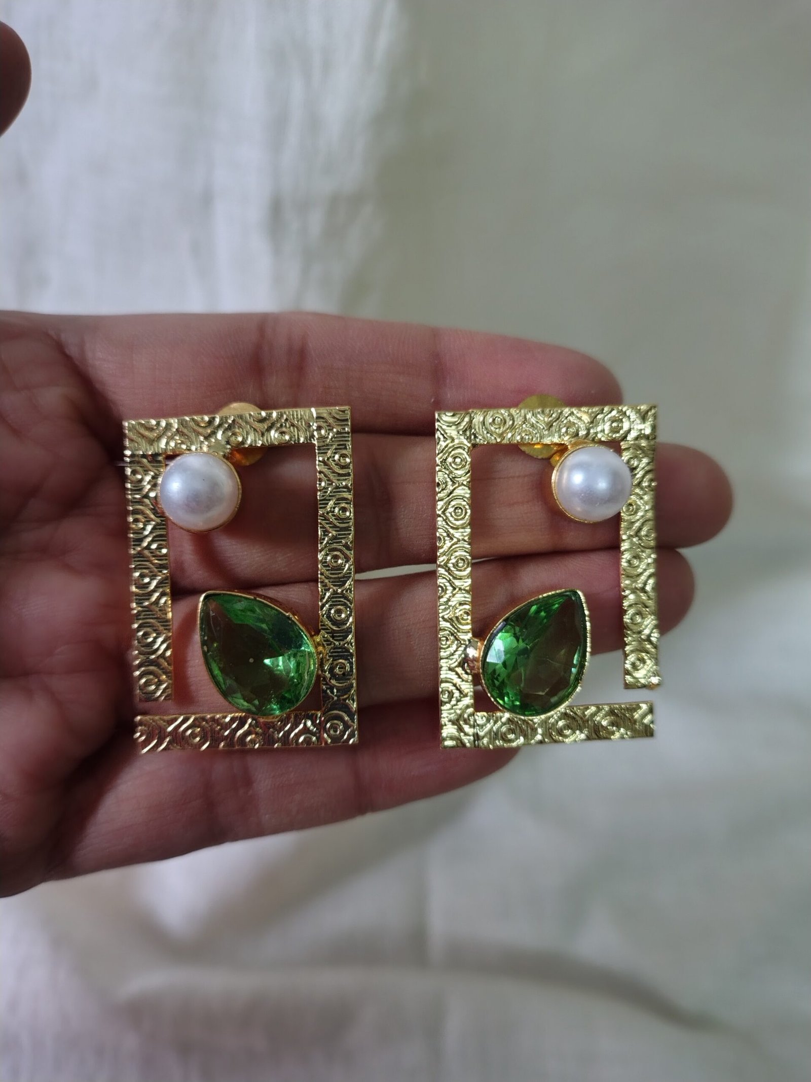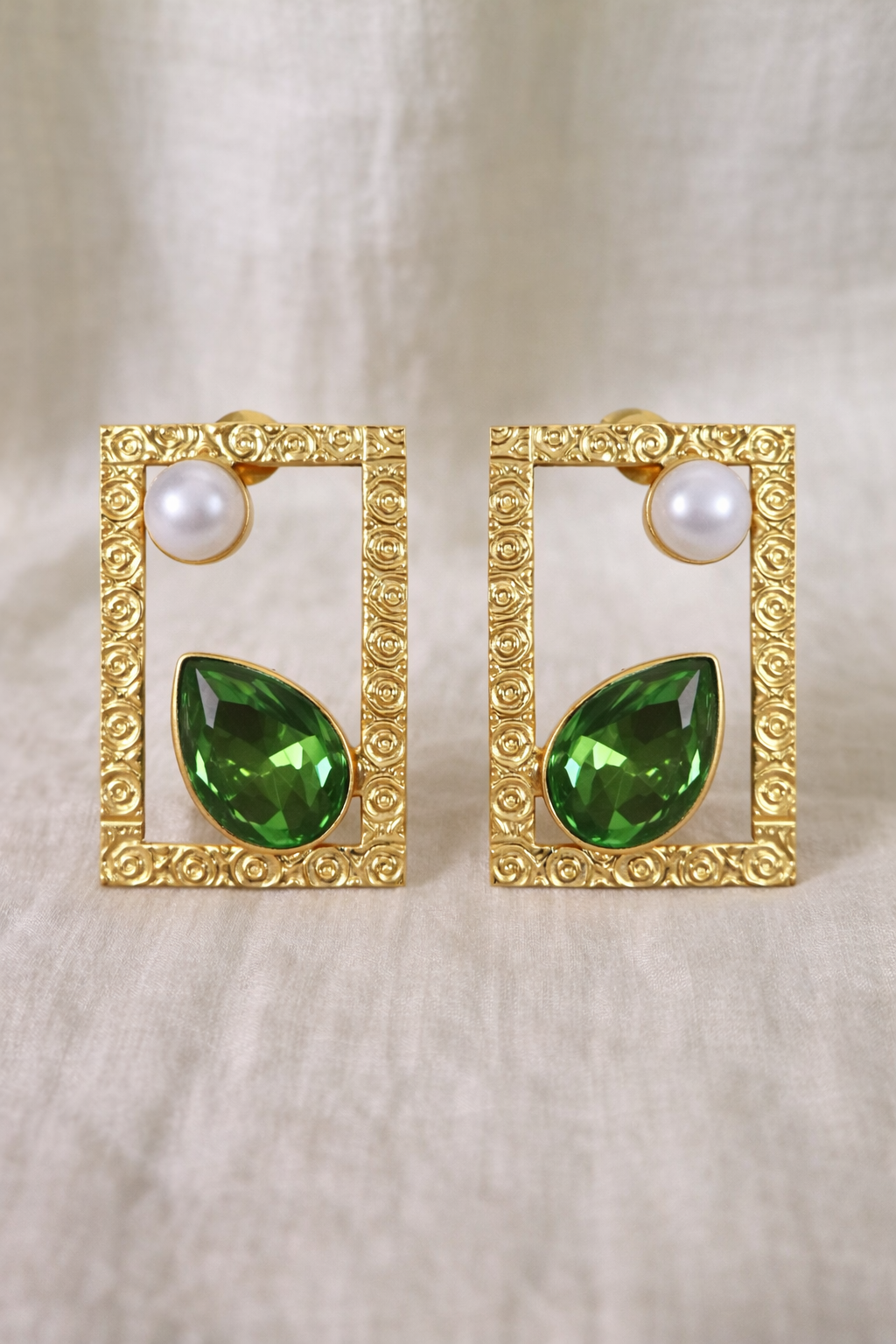 Elegant rectangular gold-frame earrings adorned with a lustrous pearl accent and a vibrant emerald-green teardrop stone. Intricate textured detailing adds a refined touch, making them perfect for festive occasions, weddings, and statement evening looks.