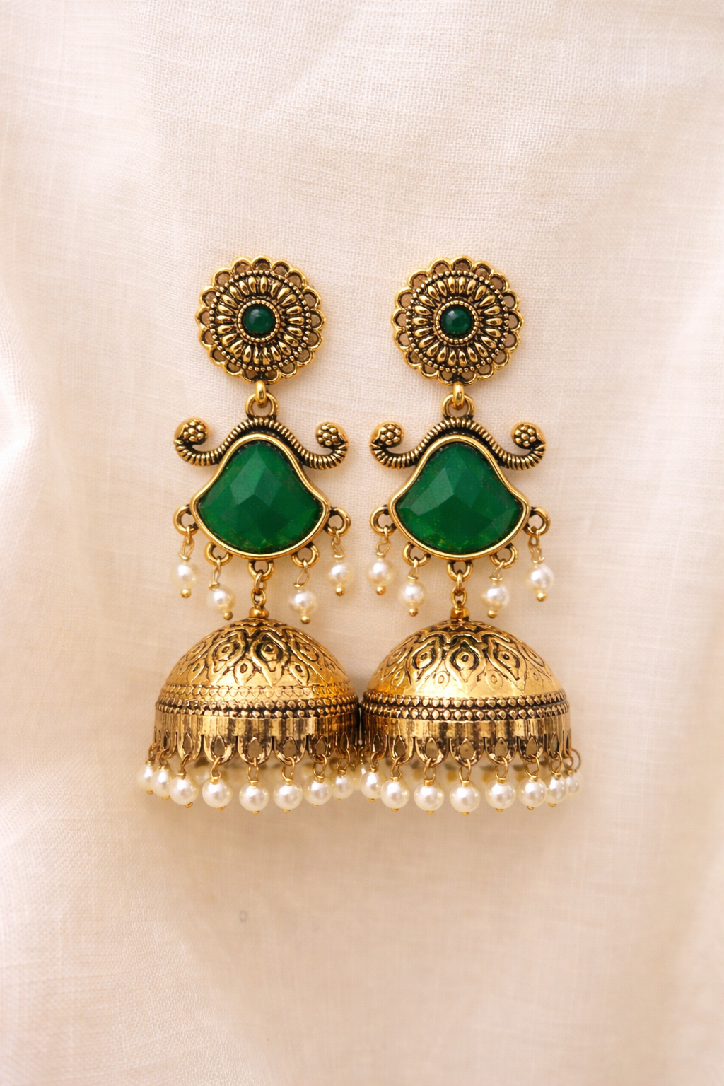 Traditional gold-tone jhumkas featuring deep green stones and pearl hangings, crafted in a timeless design perfect for festive and ethnic wear.