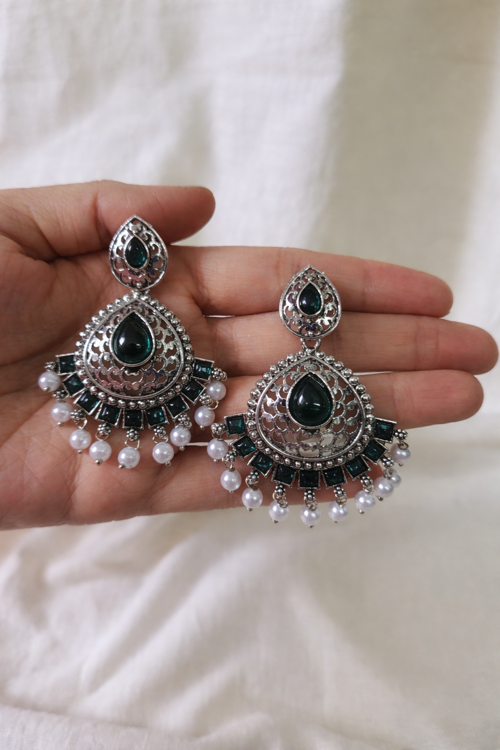 A stunning pair of statement earrings featuring rich green teardrop stones, detailed antique-finish metalwork, and soft white pearl hangings. Designed to add royal elegance and timeless beauty to ethnic and fusion outfits.