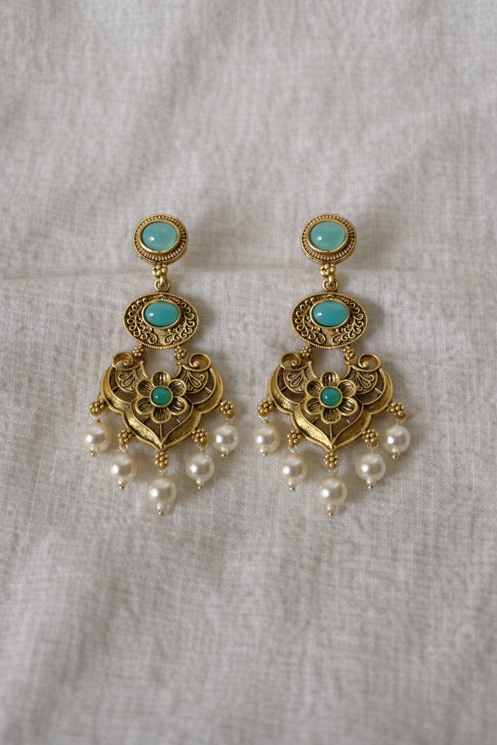 A classic handcrafted design featuring soothing blue cabochons, ornate filigree work, and delicate pearl clusters.