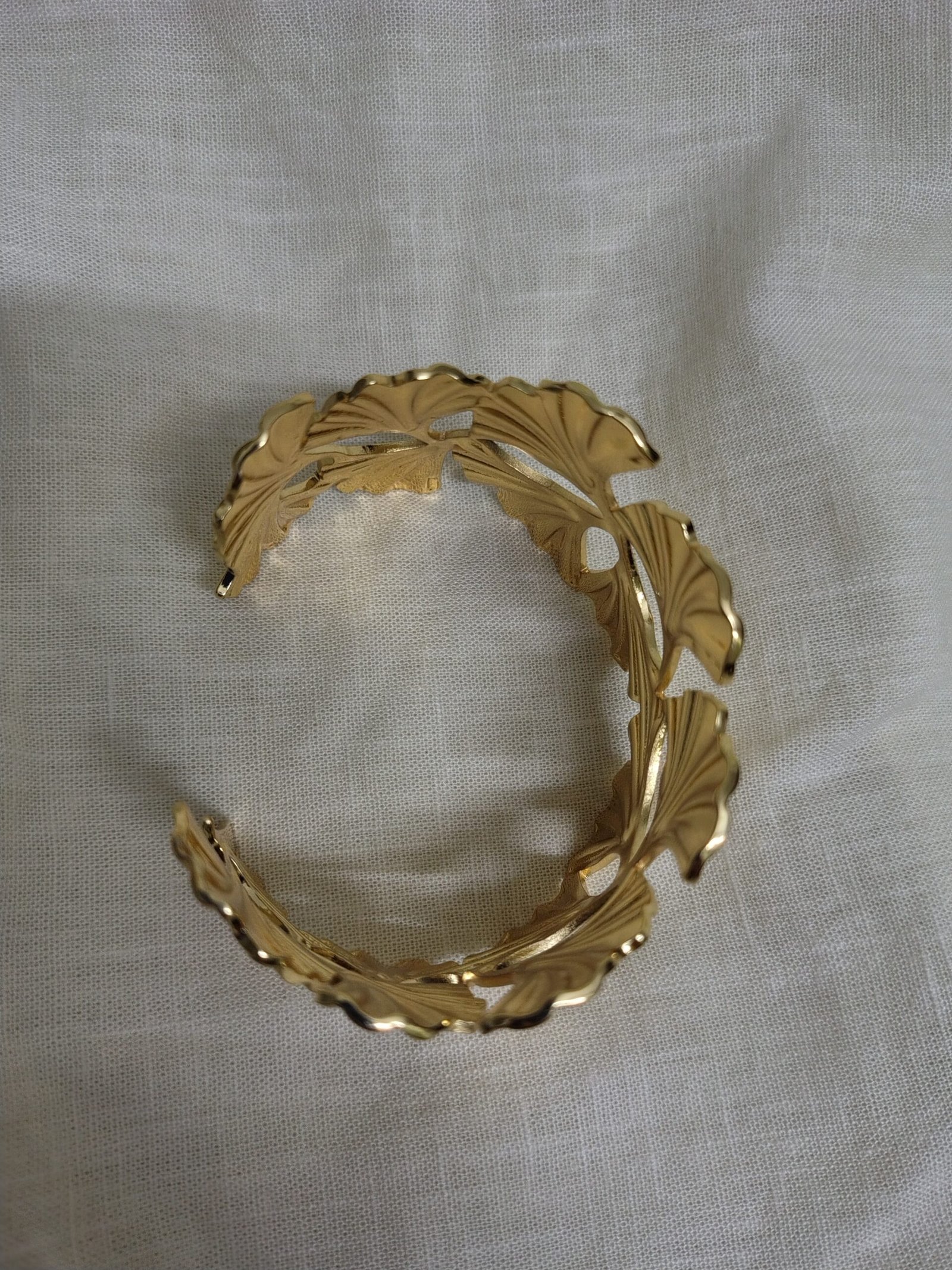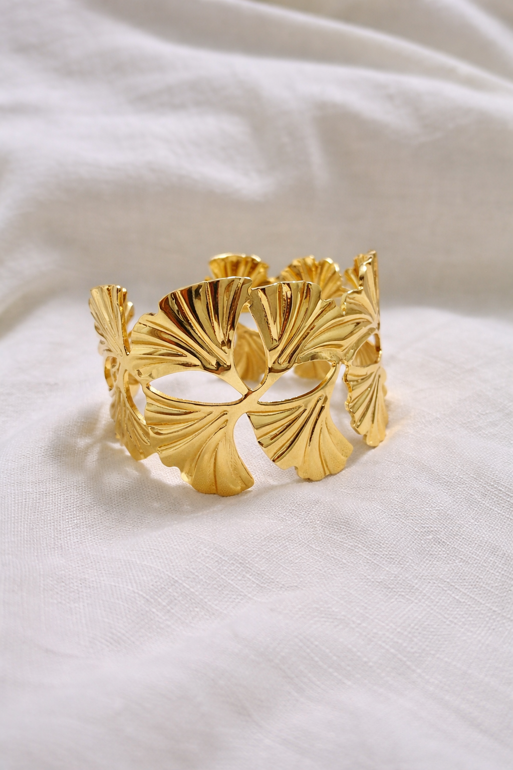 A sculptural gold-finish cuff inspired by ginkgo leaves, featuring flowing cutwork and a high-polish shine—bold, organic, and effortlessly elegant for statement styling.