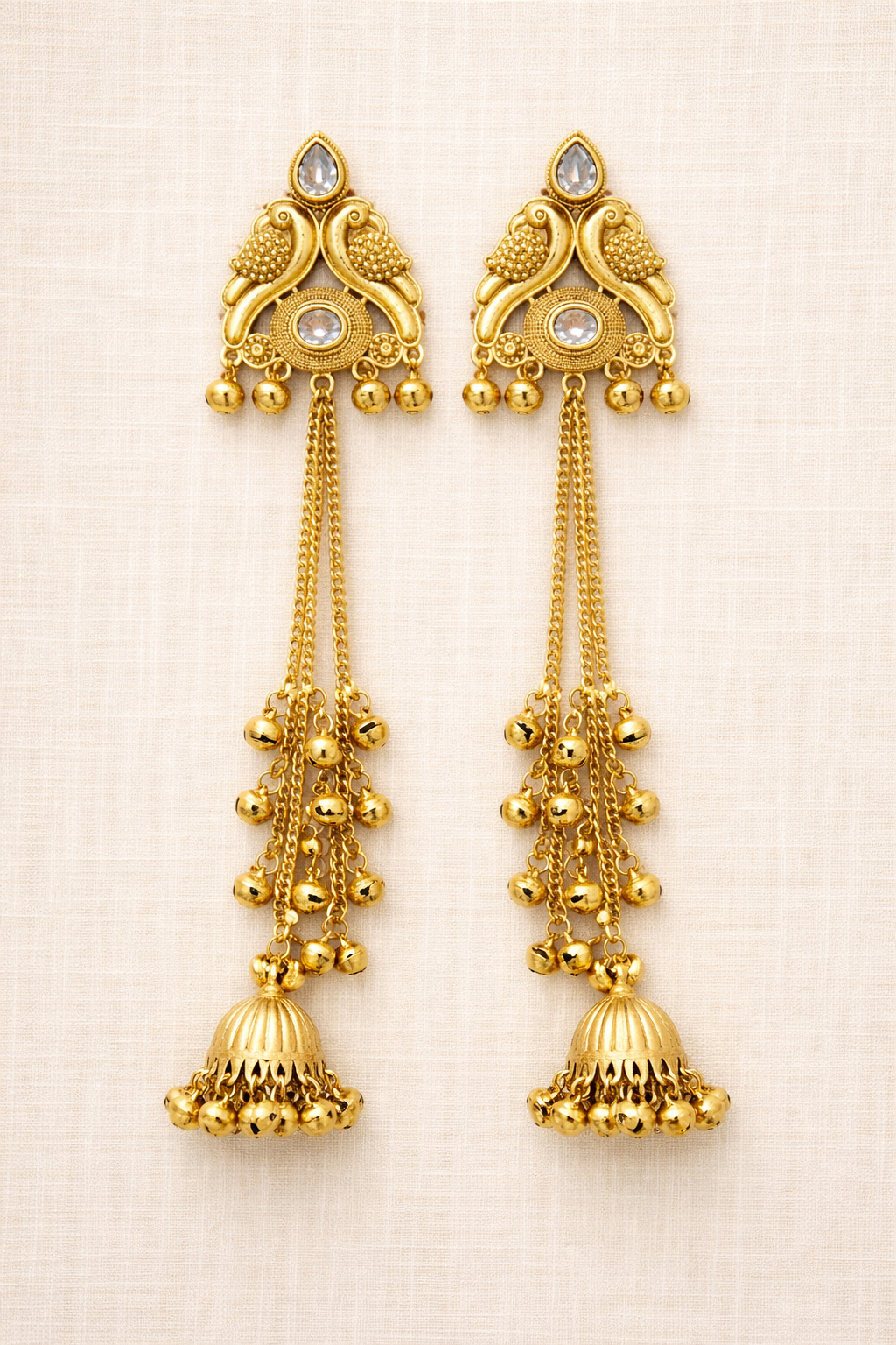 Traditional long kashmiri jhumka earrings featuring stones, intricate gold detailing, and two cascading ghungroo chains, finished with classic dome jhumkas for a graceful, festive look.