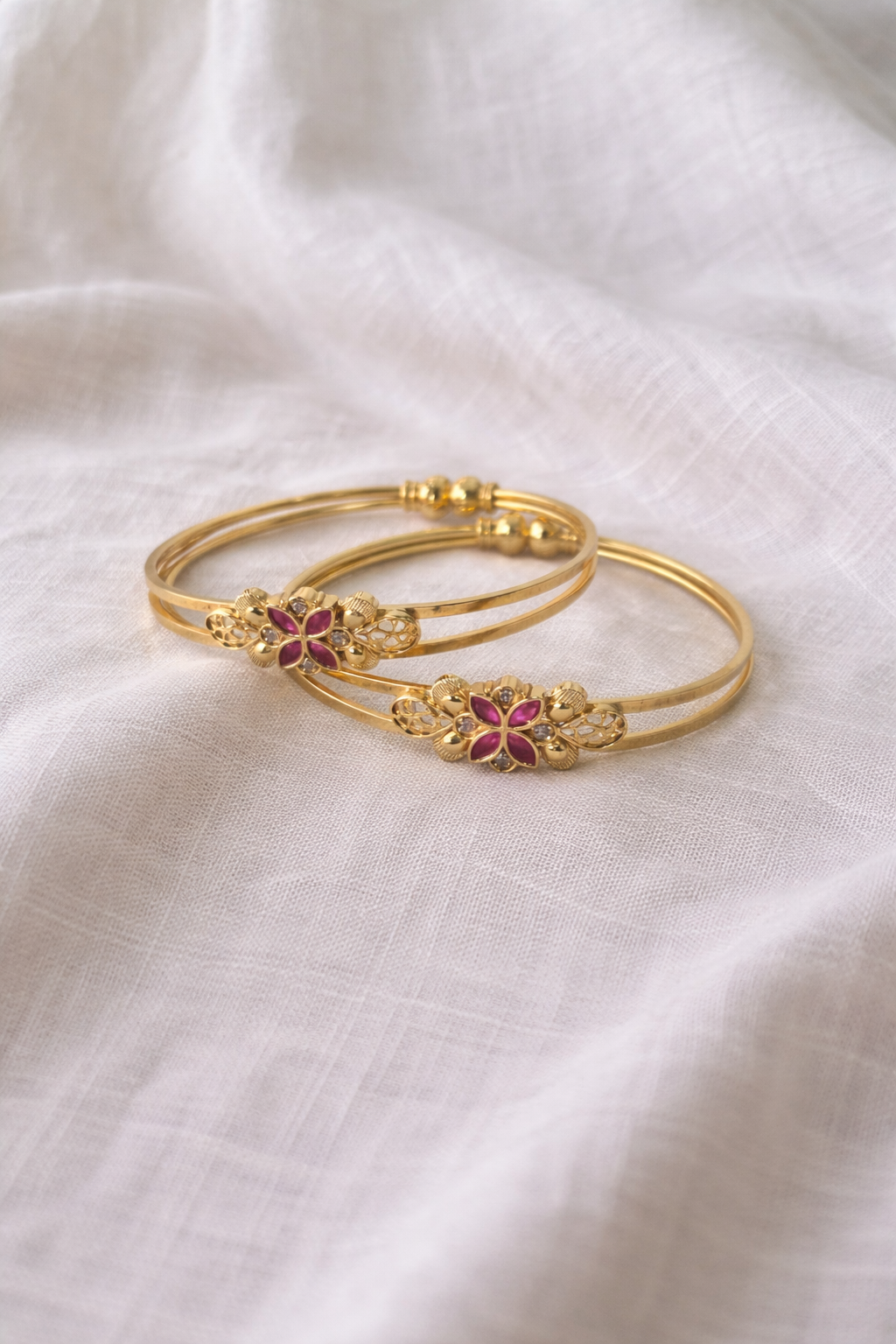 Elegant gold-tone pair adorned with a floral motif in rich ruby-pink enamel and sparkling accents. Delicately crafted to add a graceful pop of colour, these bangles are perfect for festive wear as well as refined everyday styling.