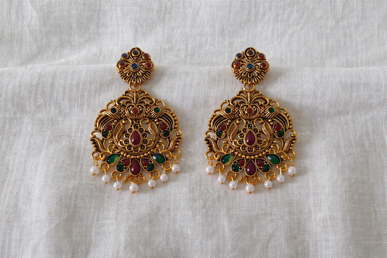 Exquisitely detailed chandbali earrings crafted in an antique gold finish, featuring intricate filigree work with rich ruby-red and emerald-green stone accents. Finished with delicate pearl drops, this regal pair reflects timeless temple-inspired artistry—perfect for weddings, festive occasions, and heirloom-style ethnic looks.