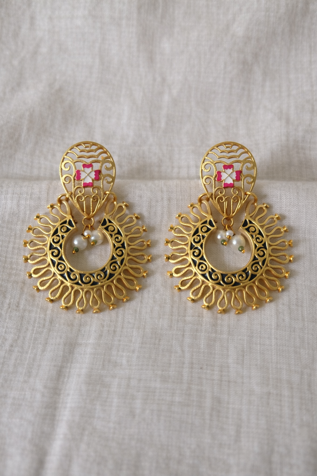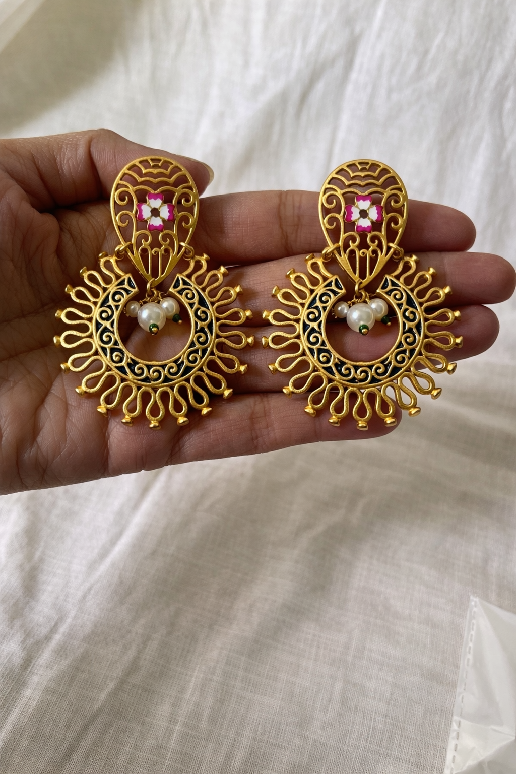 A radiant design inspired by traditional motifs, finished with glossy enamel touches and dainty pearl beads.