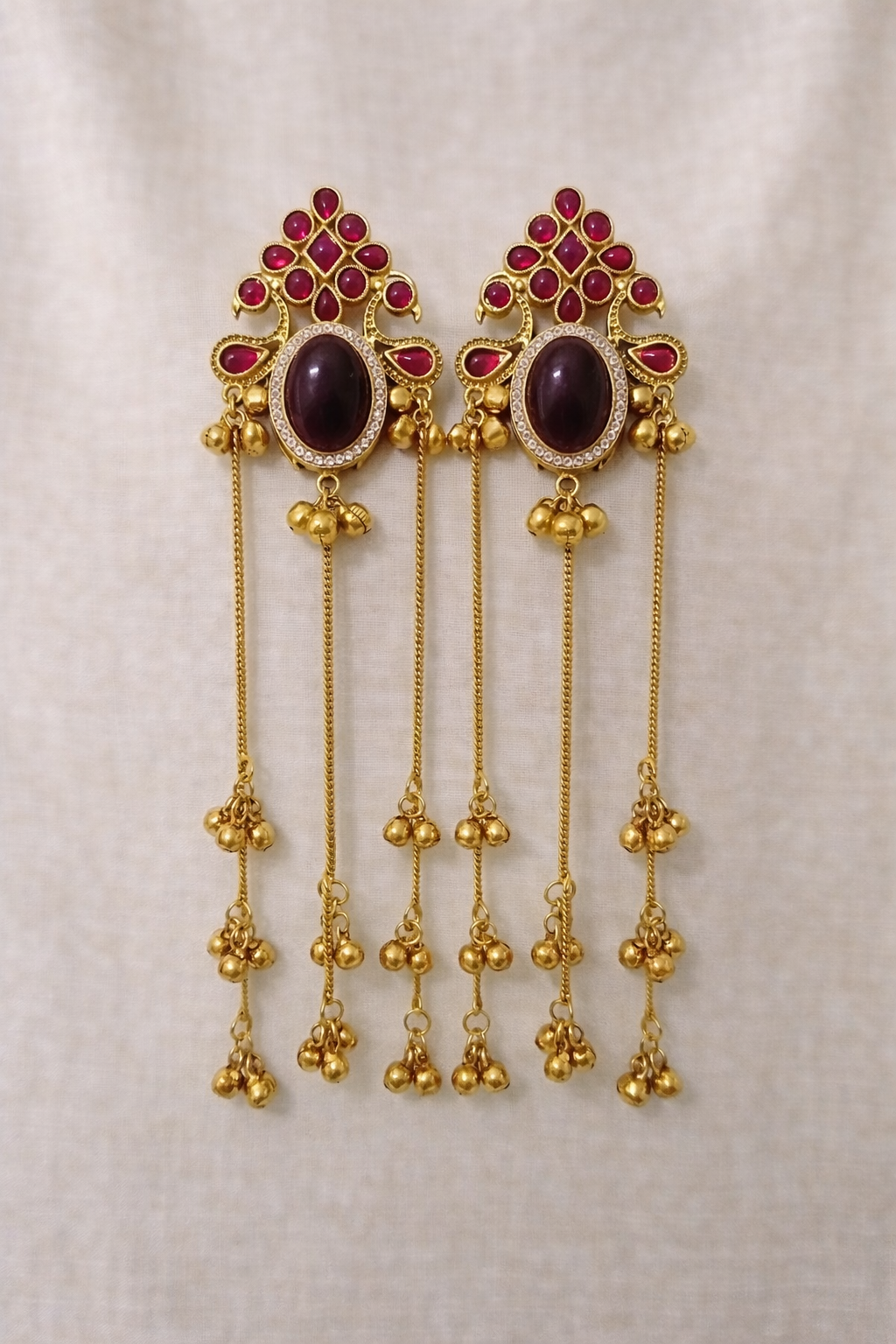 Statement gold-tone earrings featuring deep ruby stones, a bold oval center, and cascading chain tassels with ghungroo drops—perfect for festive and wedding looks.