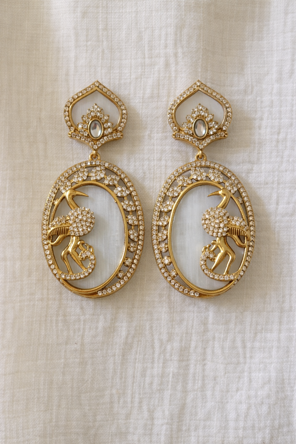 Elegant gold-tone earrings featuring a graceful peacock motif framed with shimmering stones, designed to add a regal touch to festive and traditional ensembles.