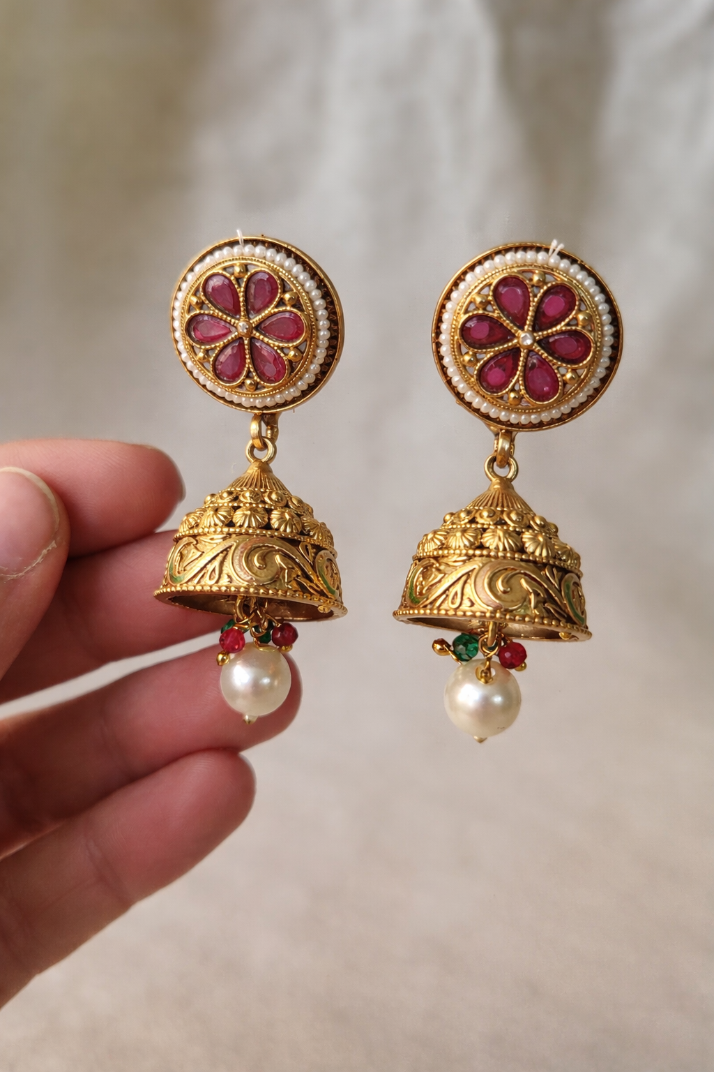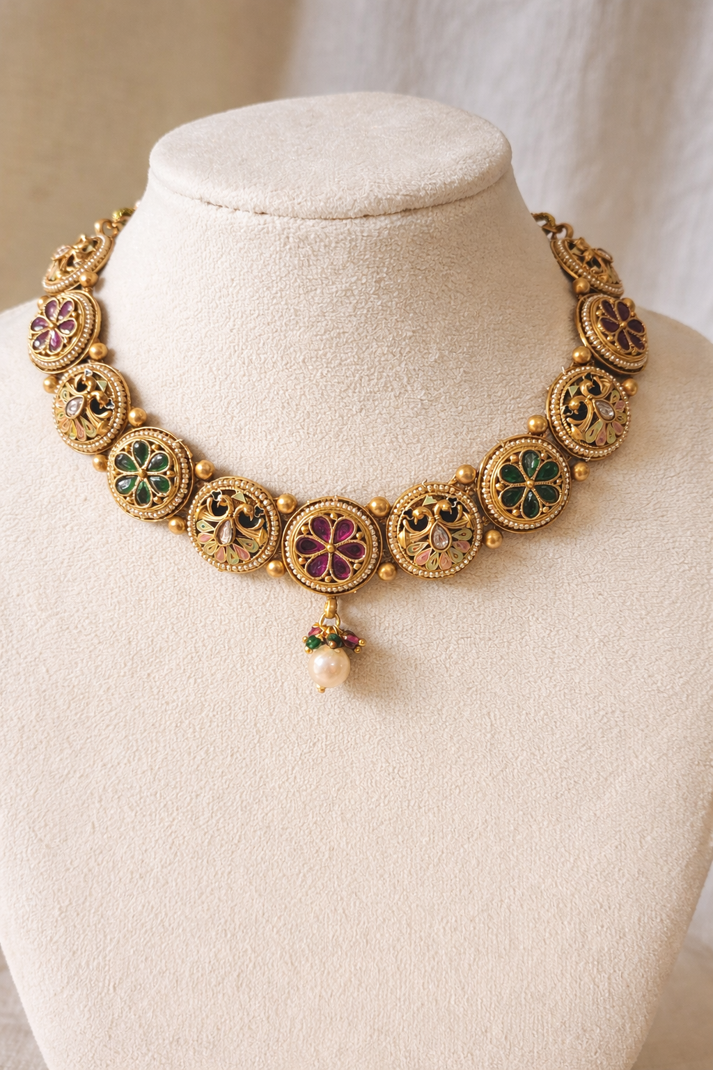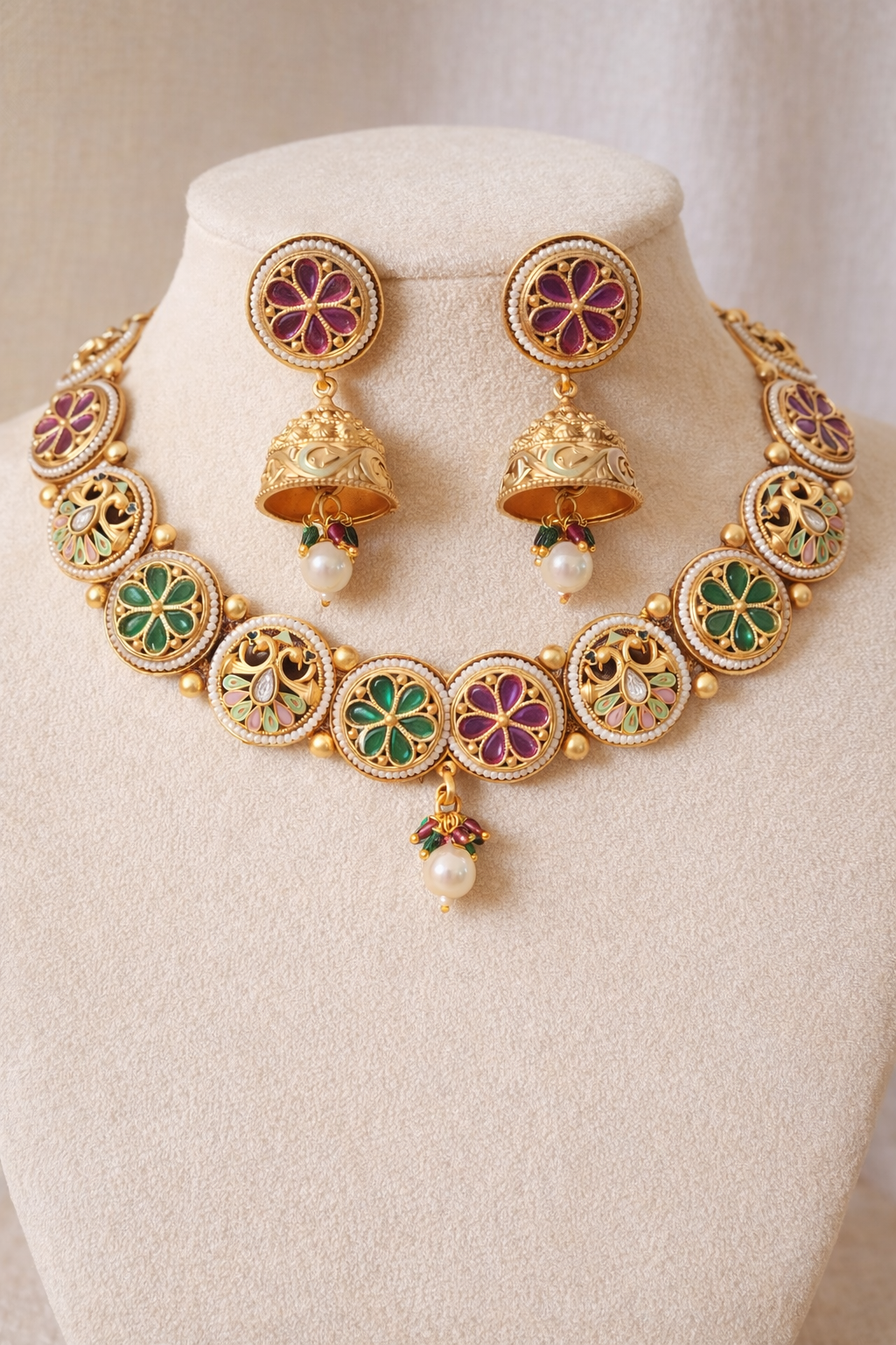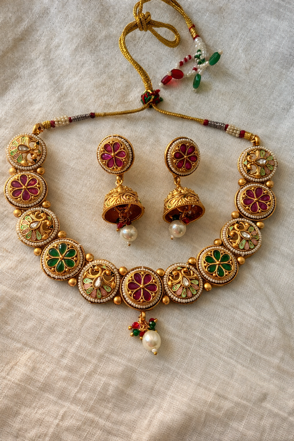 An elegant handcrafted choker set featuring intricate floral meenakari work in rich ruby pink and emerald green tones, highlighted with delicate pearls and gold detailing. Paired with classic jhumka earrings and pearl drops, this set is perfect for weddings, festive occasions, and traditional celebrations.