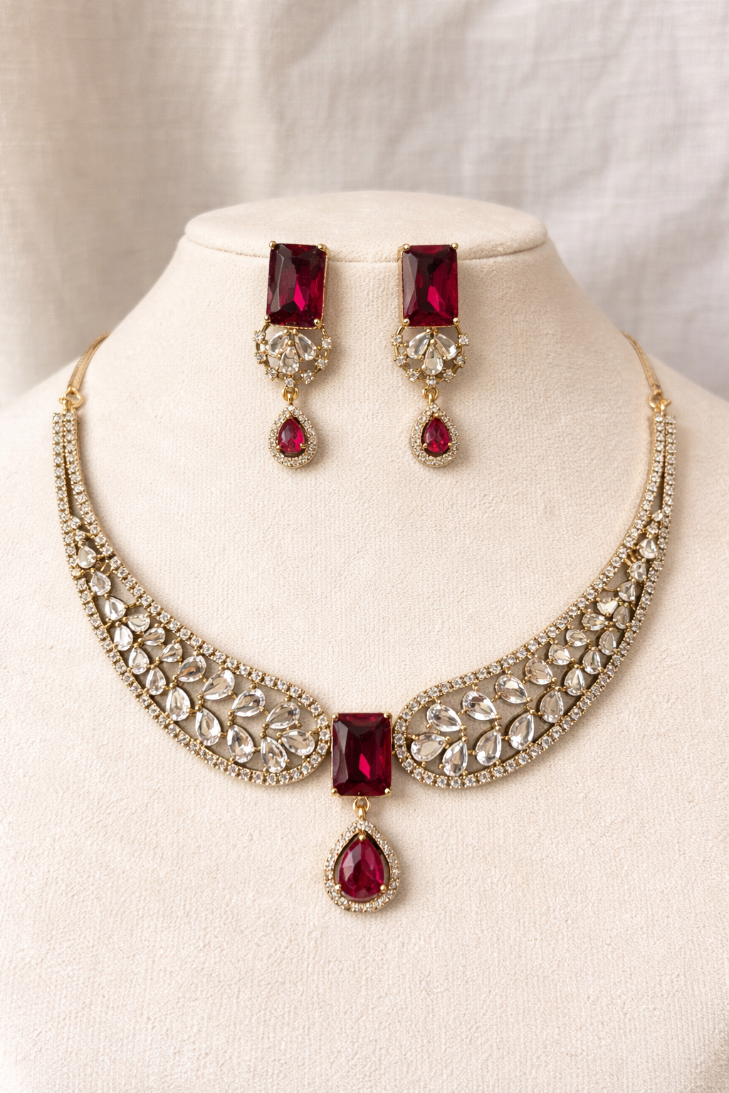 An elegant necklace set featuring deep ruby-toned stones paired with classic polki-style detailing. The graceful crescent design and matching drop earrings make it perfect for festive evenings and refined traditional looks.