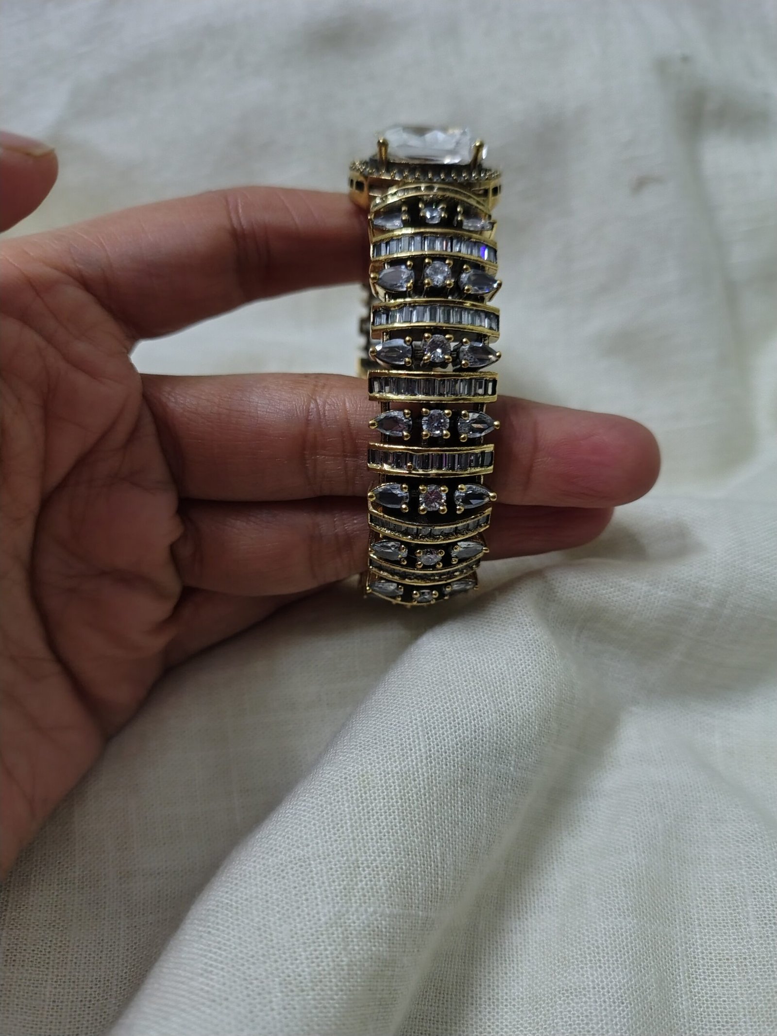 A striking statement bracelet featuring a cushion-cut crystal centre framed by a dark halo, with baguette and round accents along a gold-finish band—designed to add drama and elegance to evening and festive looks.