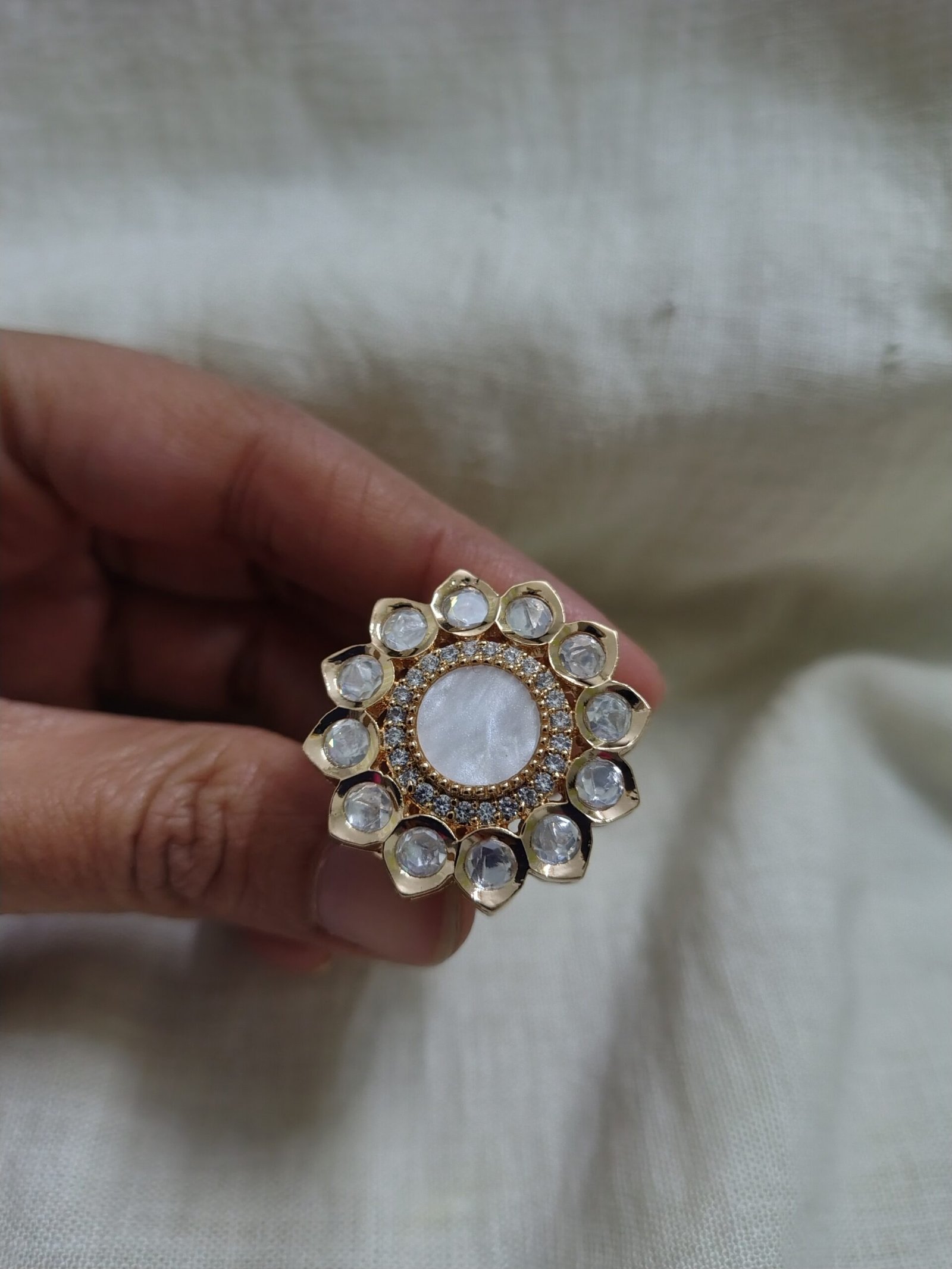 A statement gold-finish ring featuring a luminous moonstone centre encircled by petal-shaped crystal accents—elegant, timeless, and perfect for adding a soft glow to festive and occasion wear.