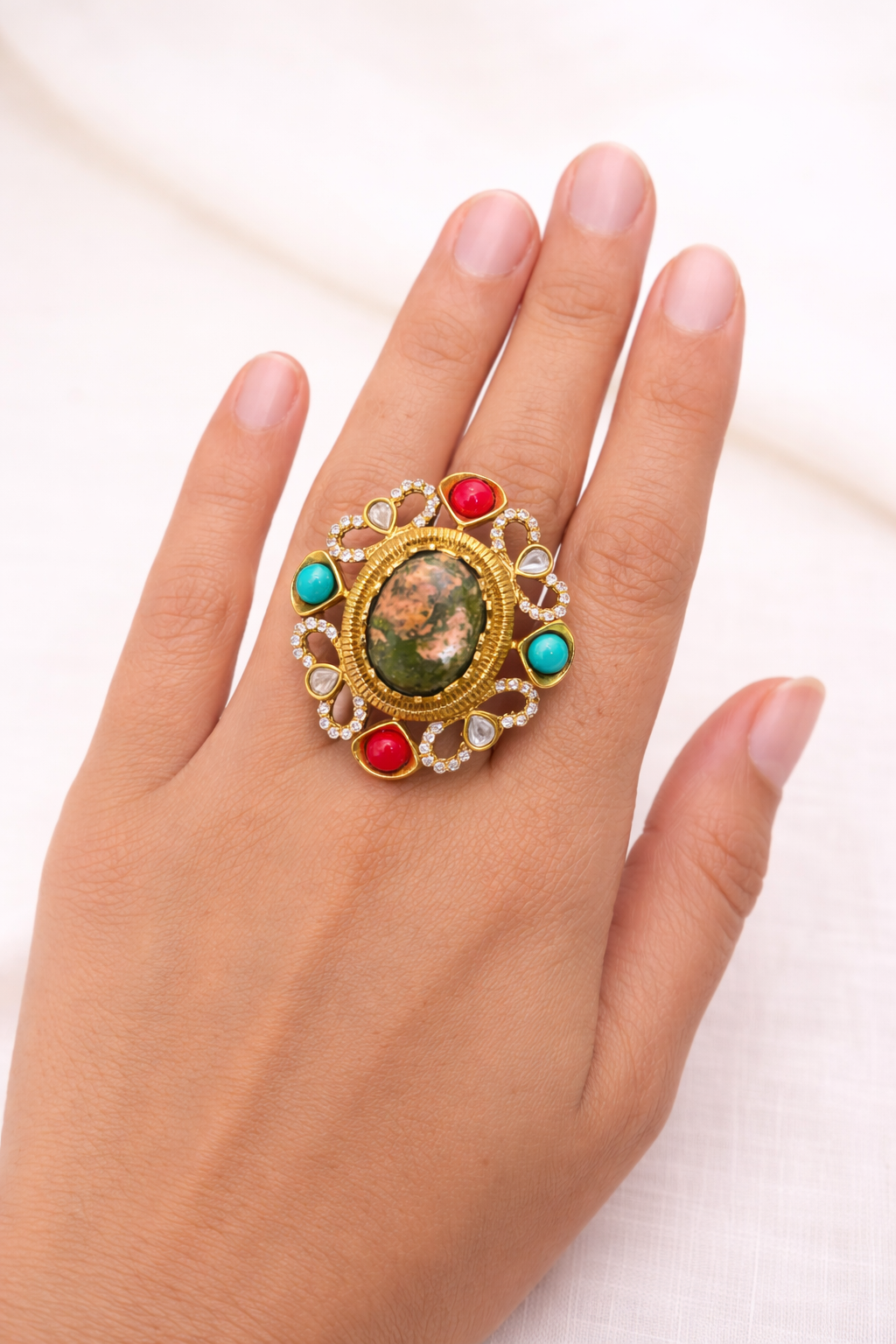 An ornate statement ring featuring a natural moss agate centre, framed with antique gold detailing, polki-style diamonds, and vibrant red and turquoise accents—crafted to bring a bold, heritage-inspired charm to festive and occasion wear.