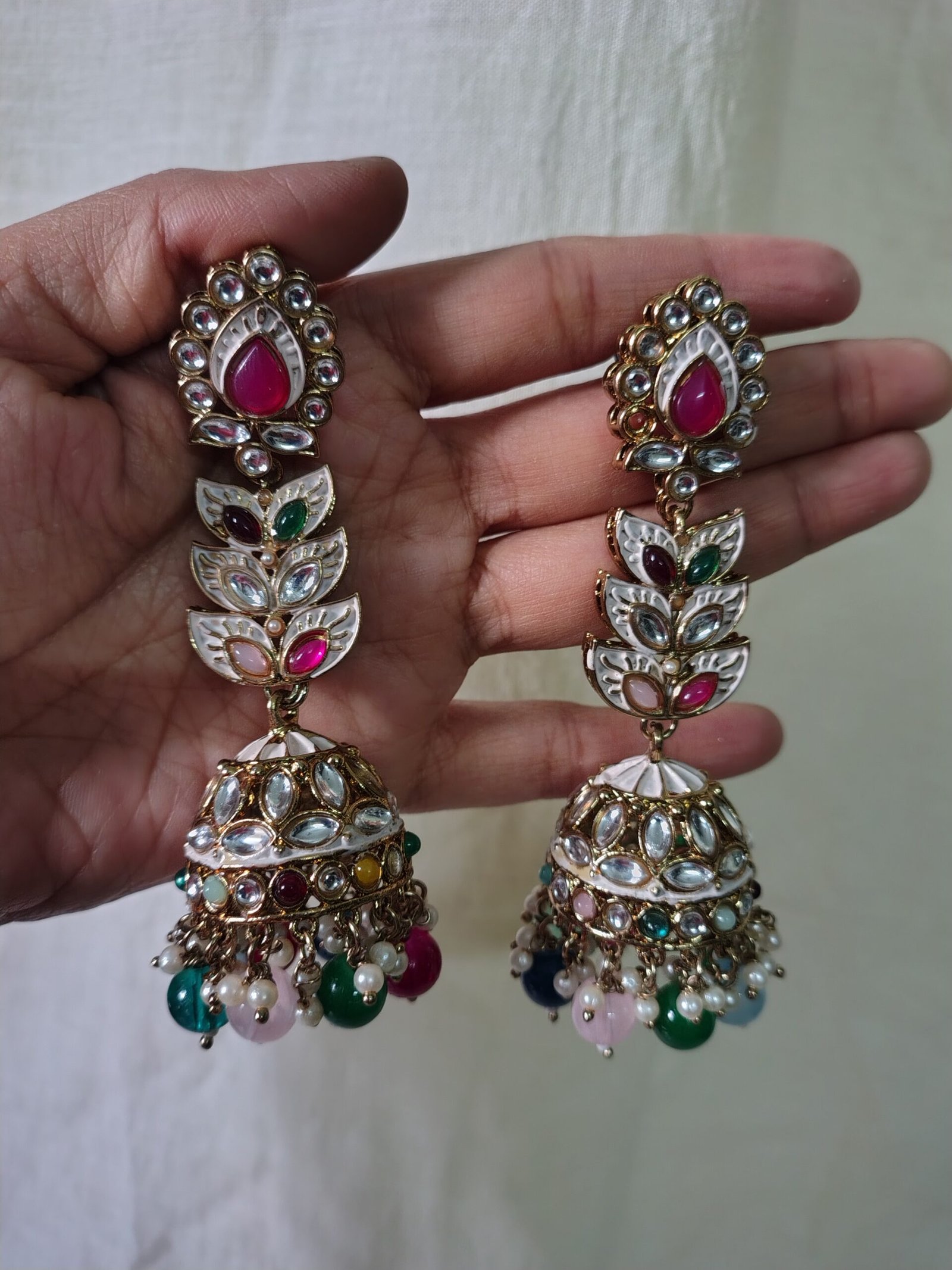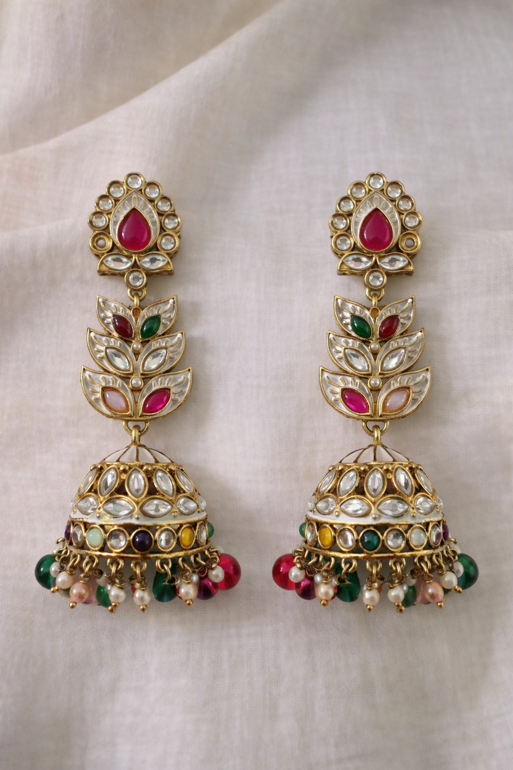 Elegant gold-tone jhumkas with kundan detailing, vibrant multicolour stones, and pearl drops—perfect for weddings, festive wear, and traditional looks.