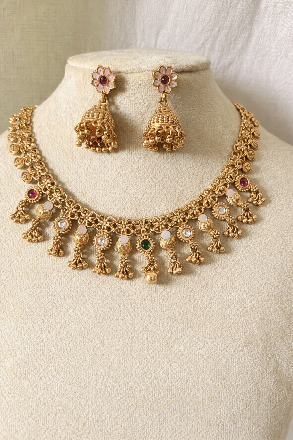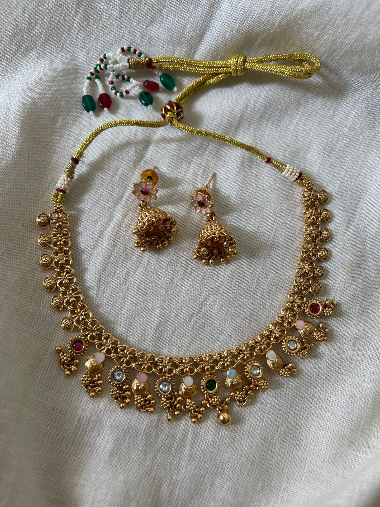 An elegant traditional gold-tone necklace set adorned with delicate multicolor stones and charming jhumka danglers. The intricately linked floral chain is highlighted with pastel enamel accents and clear, ruby-pink, and emerald-green stones, creating a graceful blend of heritage and softness.