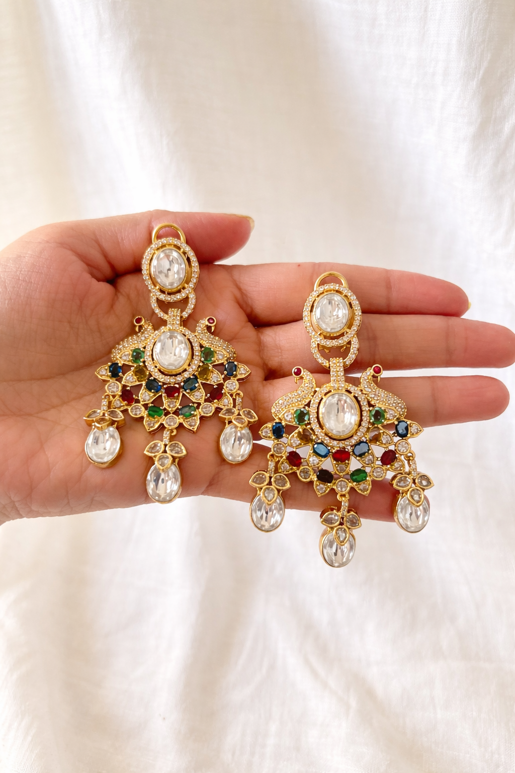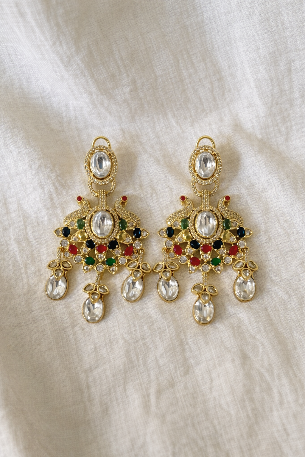 Graceful gold-tone chandbali style earrings with back clip adorned with shimmering kundan stones and vibrant navratna accents. Finished with elegant drop details, these statement earrings blend classic heritage with festive charm—perfect for weddings, celebrations, and traditional ensembles.