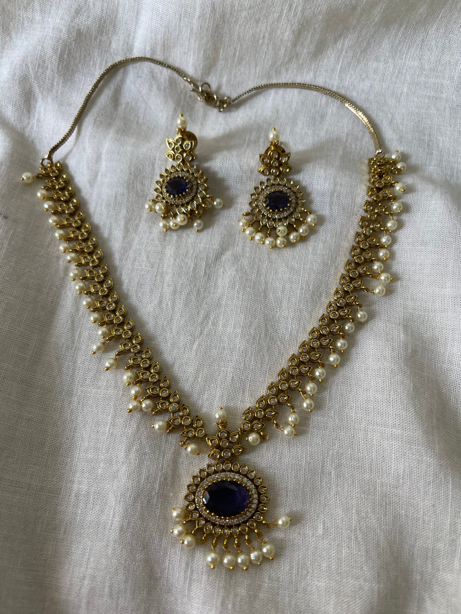 A regal long necklace set crafted in gold tones and adorned with deep sapphire-blue centerpiece stones, surrounded by shimmering polki-style crystals and delicate pearl drops.