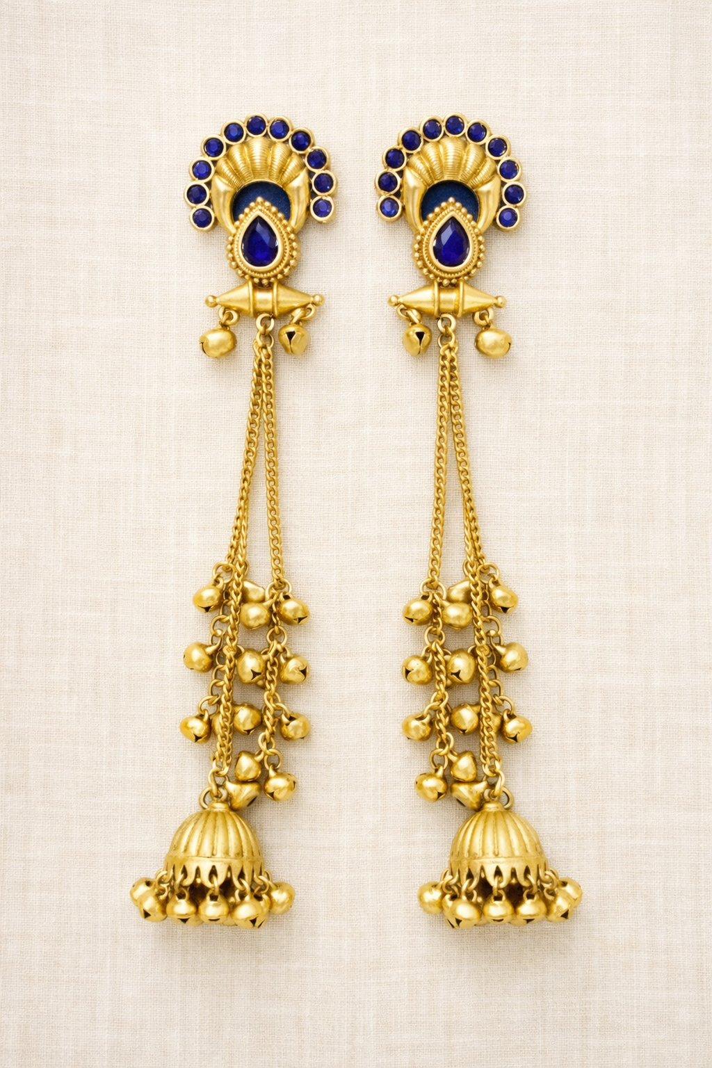 Traditional long blue kashmiri jhumka earrings featuring ruby-toned stones, intricate gold detailing, and two cascading ghungroo chains, finished with classic dome jhumkas for a graceful, festive look.