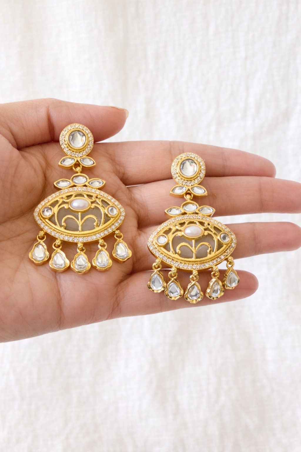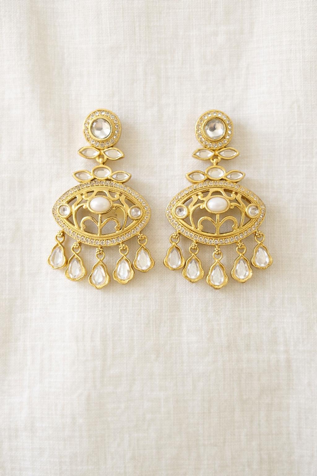 Graceful gold-toned polki earrings featuring intricate filigree work, soft pearl accents, and dangling teardrop stones—designed to reflect timeless elegance with a light, festive shimmer.
