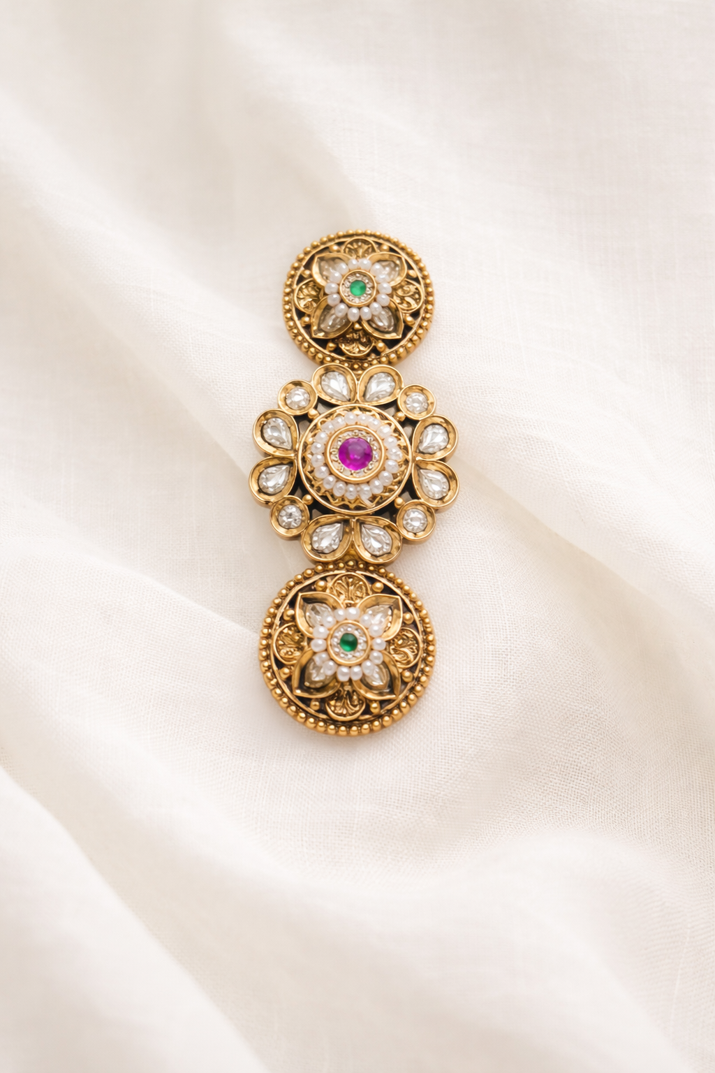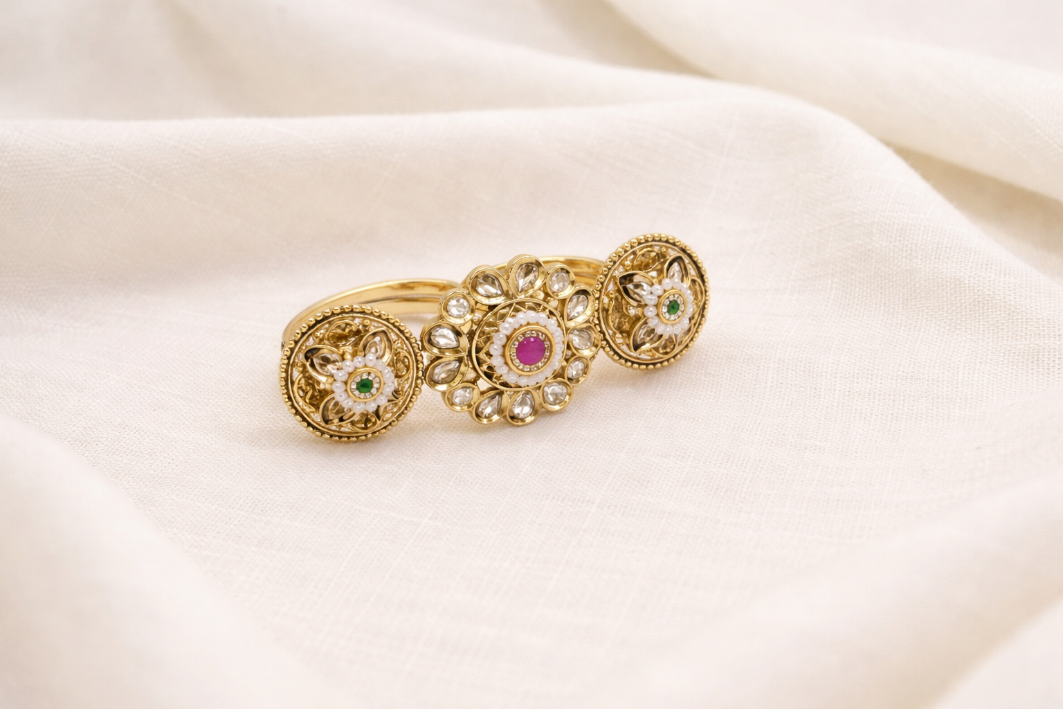 A statement triple-finger ring crafted in antique gold tones, adorned with polki-style diamonds, a vibrant ruby centre, and emerald accents—perfect for festive soirées and regal occasions.