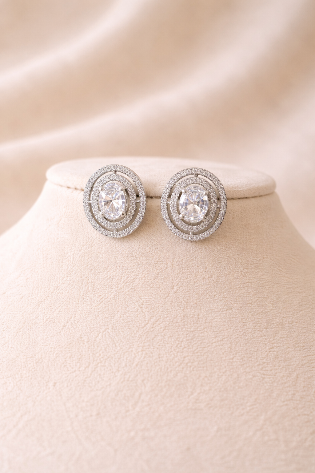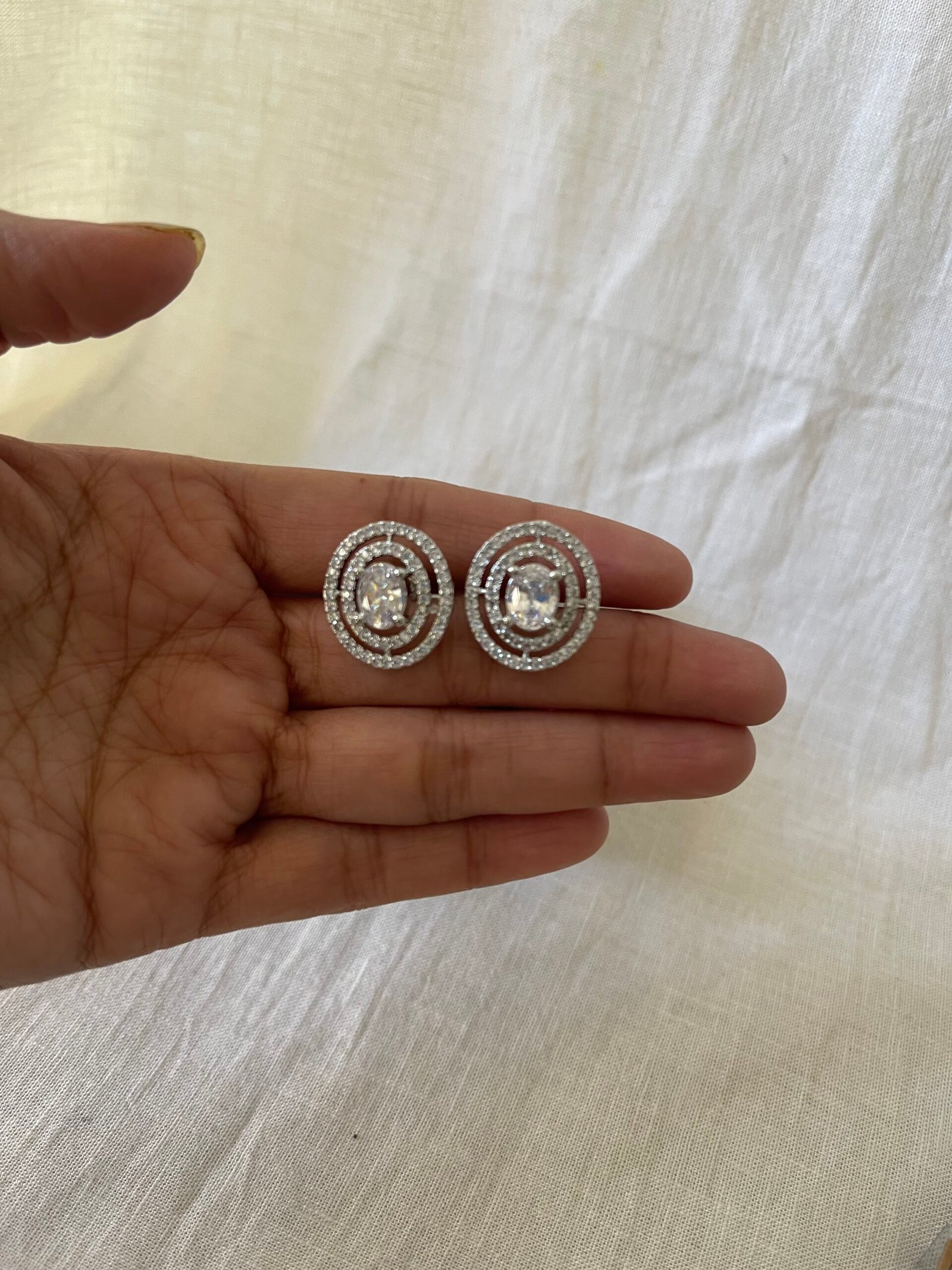 Minimal silver-tone american diamond stud earrings featuring a brilliant center stone framed by concentric pavé circles, perfect for everyday elegance and subtle evening sparkle.
