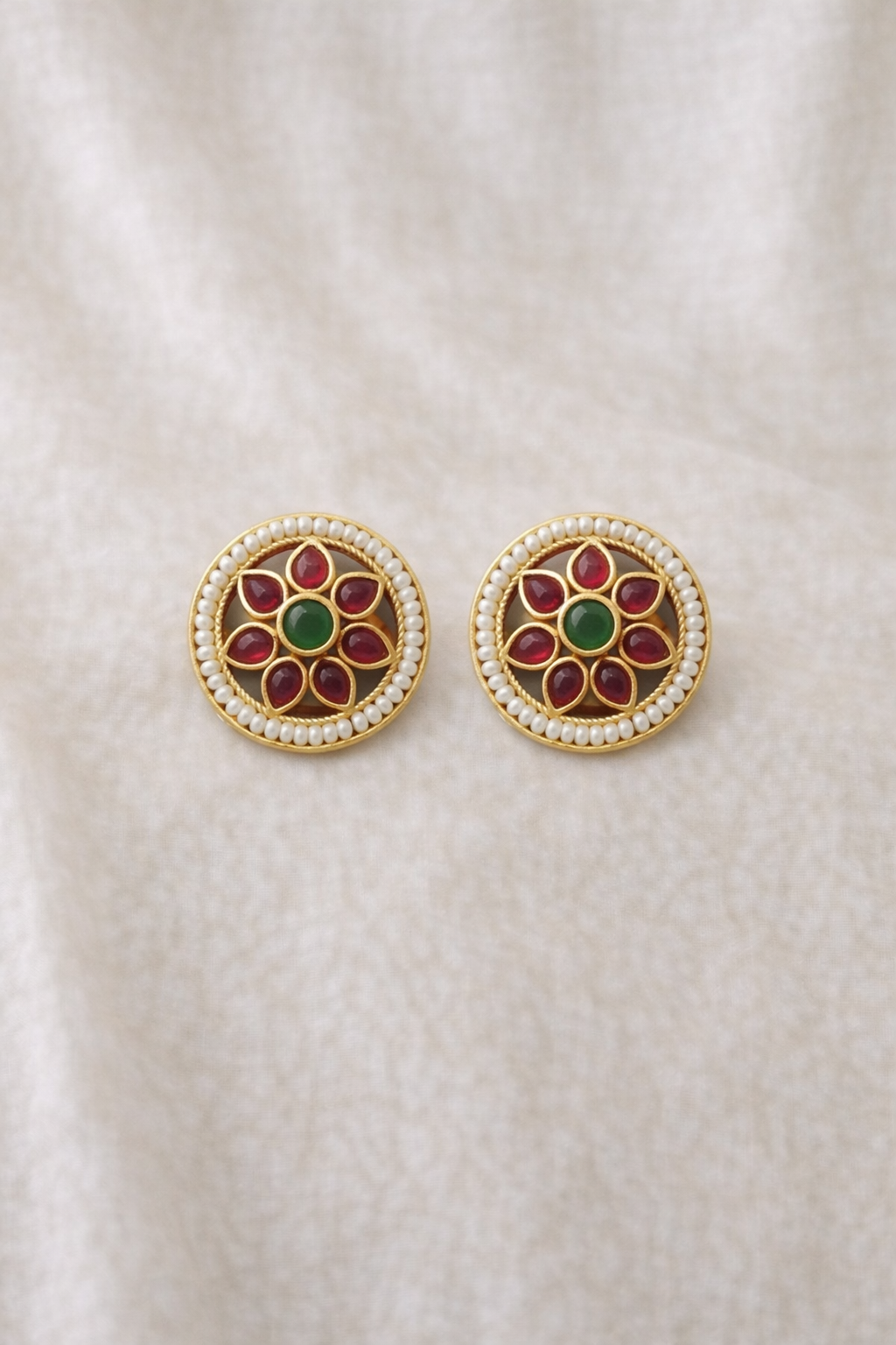 Elegant round stud earrings inspired by a blooming lotus, featuring deep ruby-toned stones around a rich green center, framed with delicate pearl detailing—perfect for festive and traditional wear.