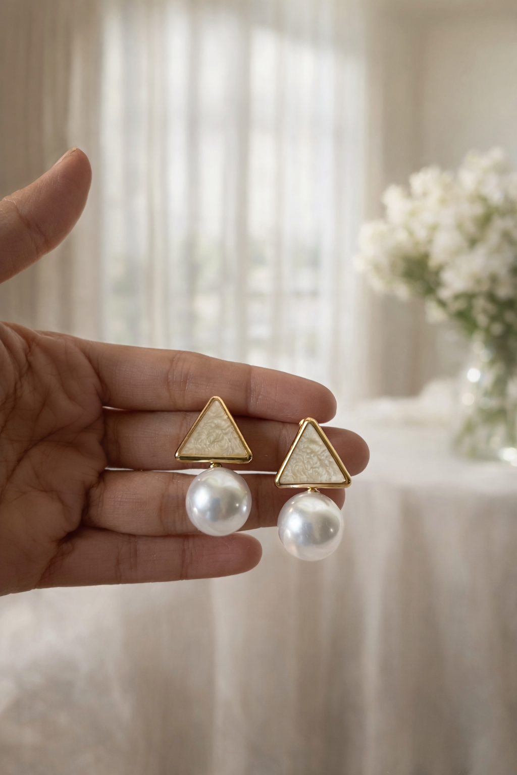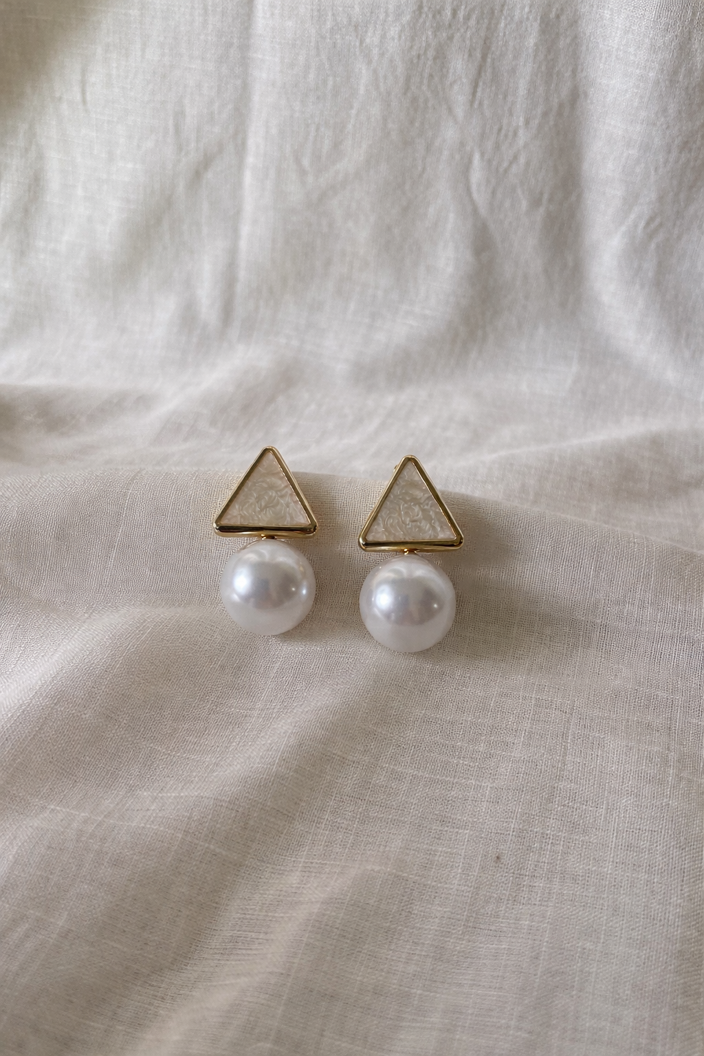 Elegant triangle studs with delicate mother-of-pearl detailing, finished with a luminous pearl drop. A perfect blend of modern geometry and timeless grace.