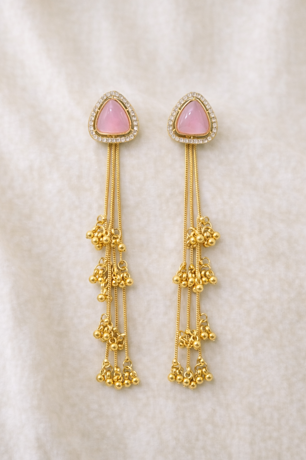 Elegant long tassel earrings featuring soft pink stones framed with delicate sparkle and flowing gold bead chains—perfect for adding a graceful, festive touch to any ethnic look.