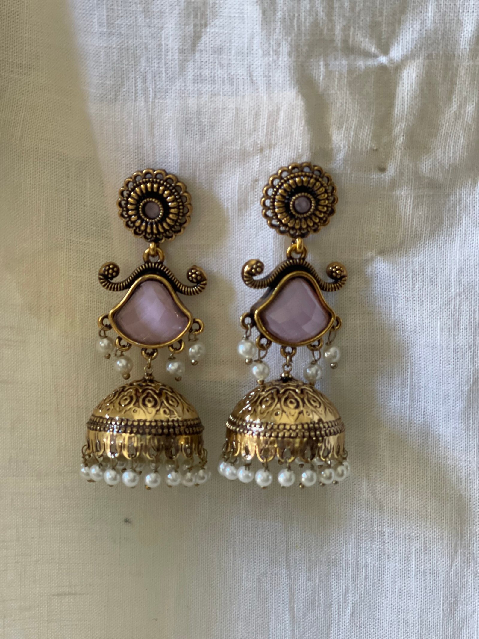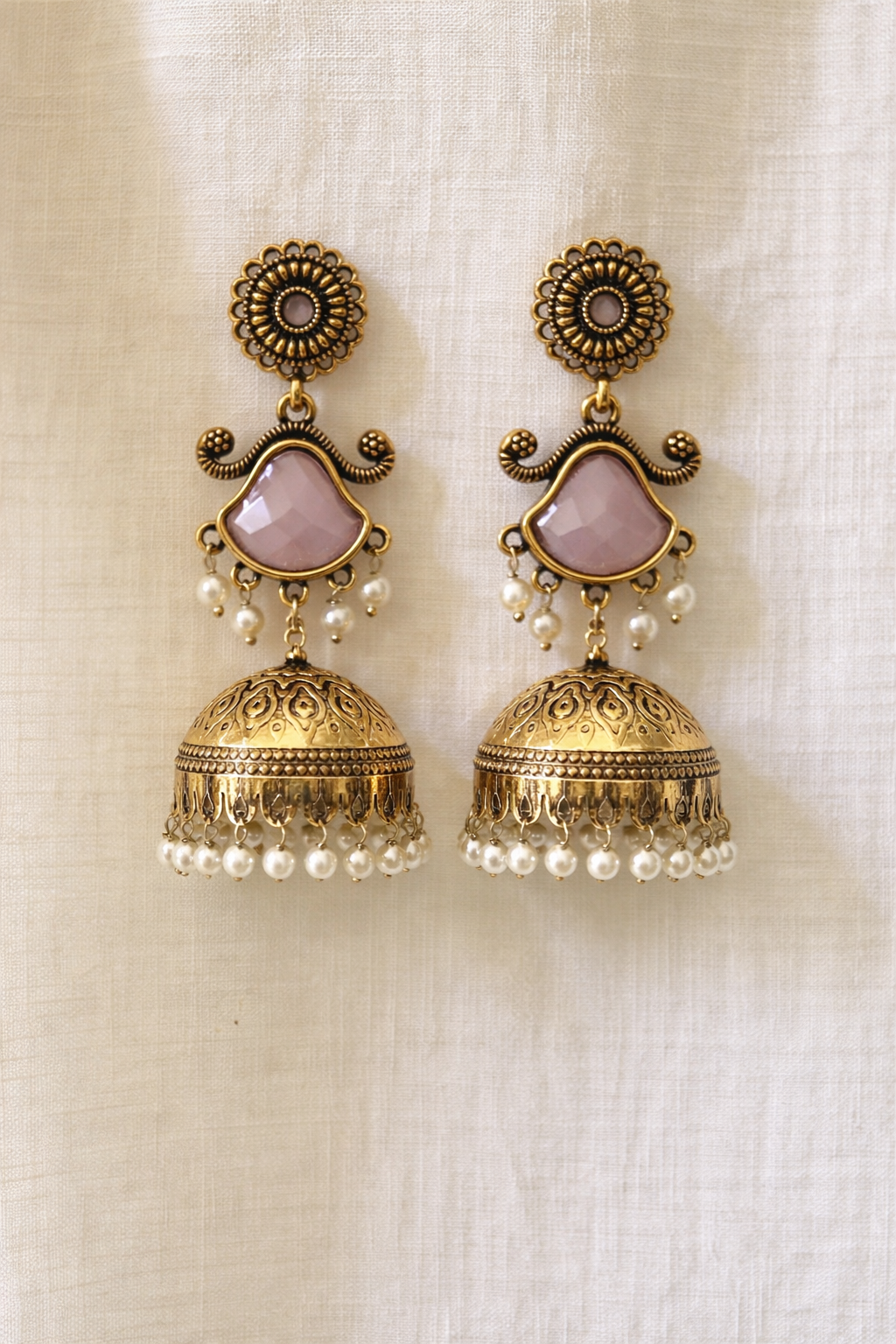 Elegant antique gold-tone jhumka earrings featuring soft blush-pink stone accents, intricate detailing, and pearl hangings—perfect for festive occasions and timeless ethnic looks.