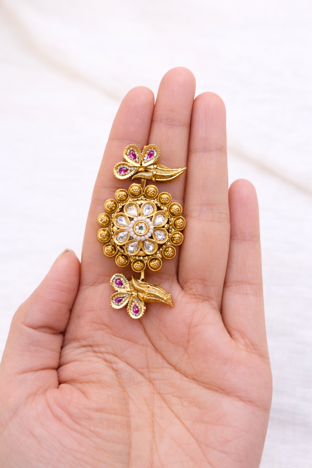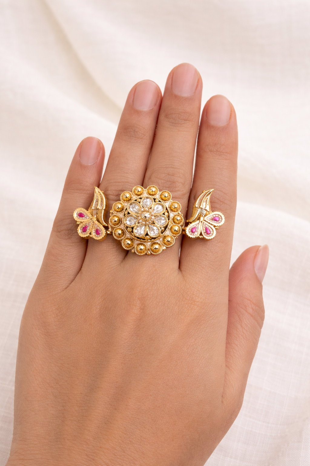 A charming statement ring inspired by blooming florals and delicate butterflies, crafted in antique gold tones with polki-style diamonds, pearl detailing, and ruby accents—perfect for adding a graceful, festive touch to traditional and fusion looks.