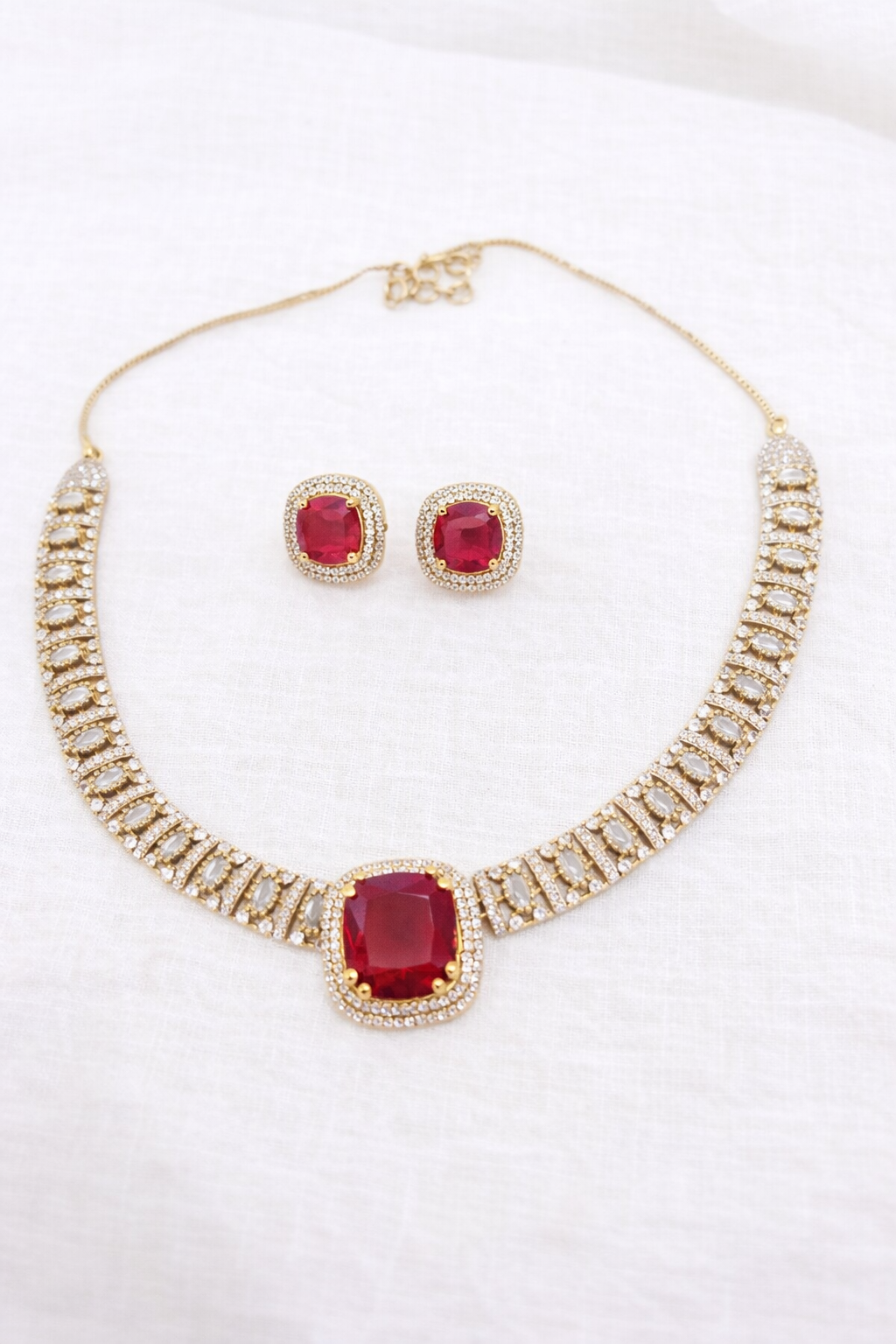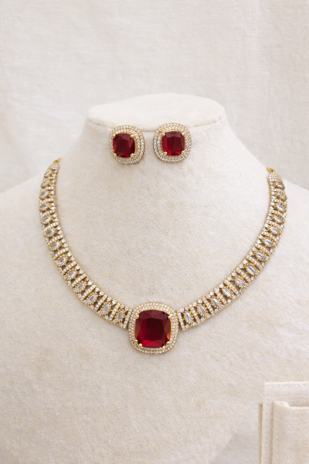 A regal necklace set featuring a bold cushion-cut ruby centre framed with shimmering diamond accents, paired with matching ruby stud earrings. Crafted in warm gold tones, this timeless set is perfect for weddings, festive evenings, and elegant formal occasions.