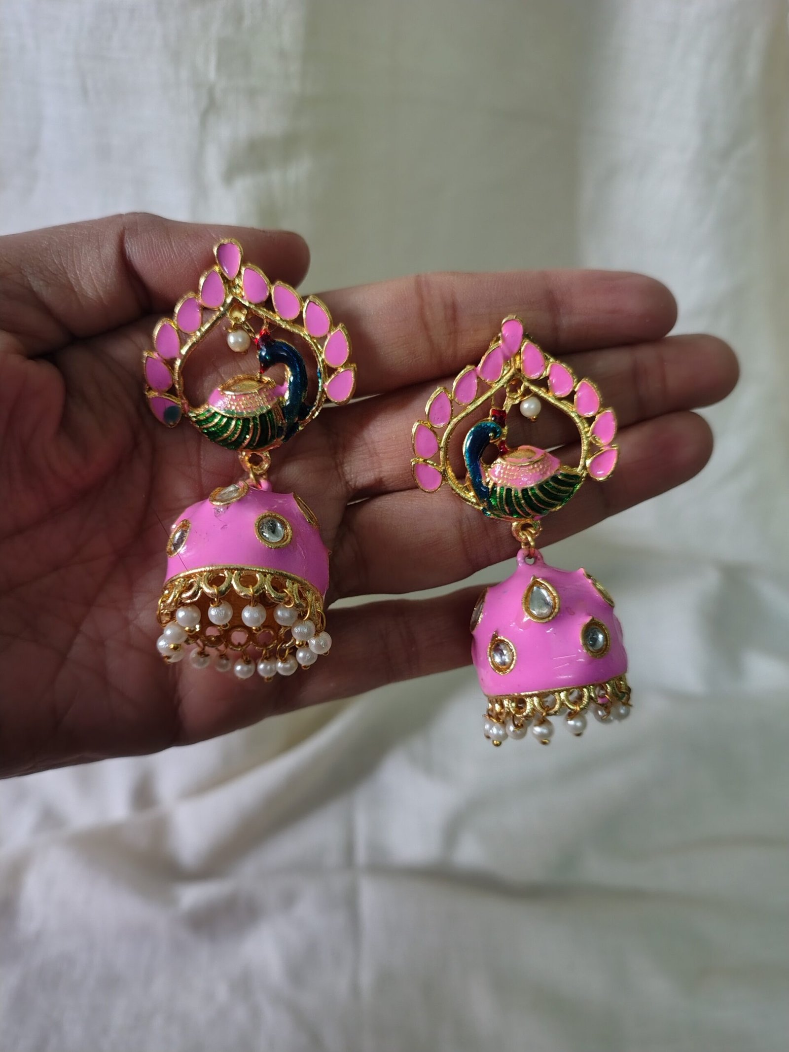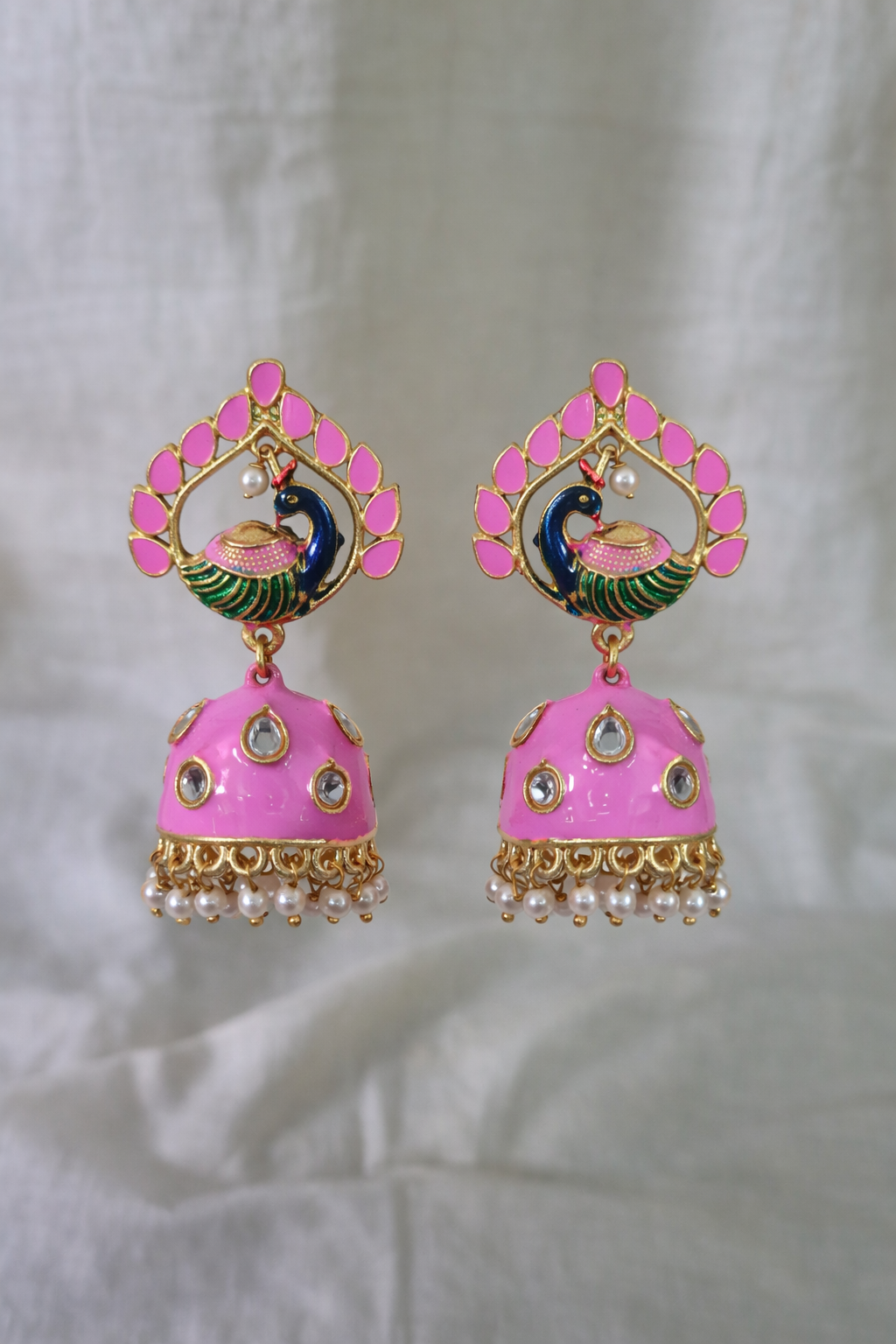 Elegant peacock-motif jhumkas crafted in rich gold tone with glossy baby-pink enamel domes. The design features intricate peacock detailing in deep blue and green, highlighted with kundan-style stones and delicate pearl hangings