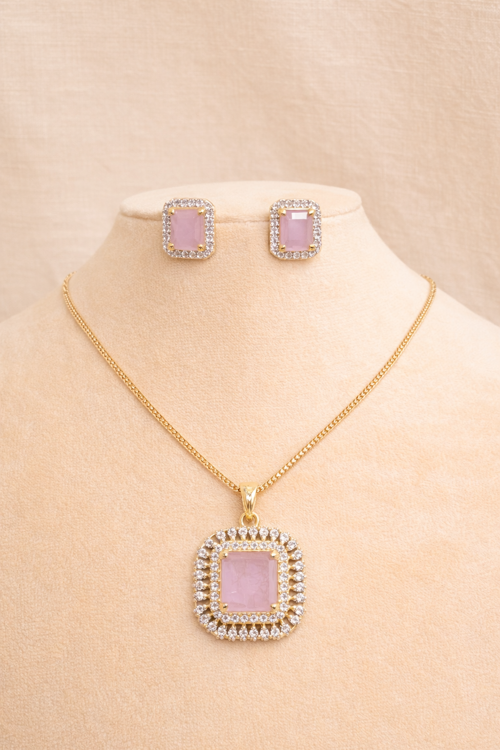 A refined pendant set featuring a soft blush-pink stone framed by shimmering american diamonds, paired with matching stud earrings. Designed on a warm ivory base, this elegant set is perfect for understated luxury and everyday sophistication (Chain not included)