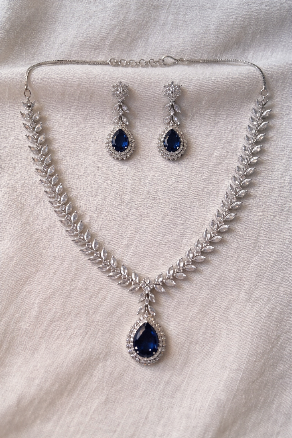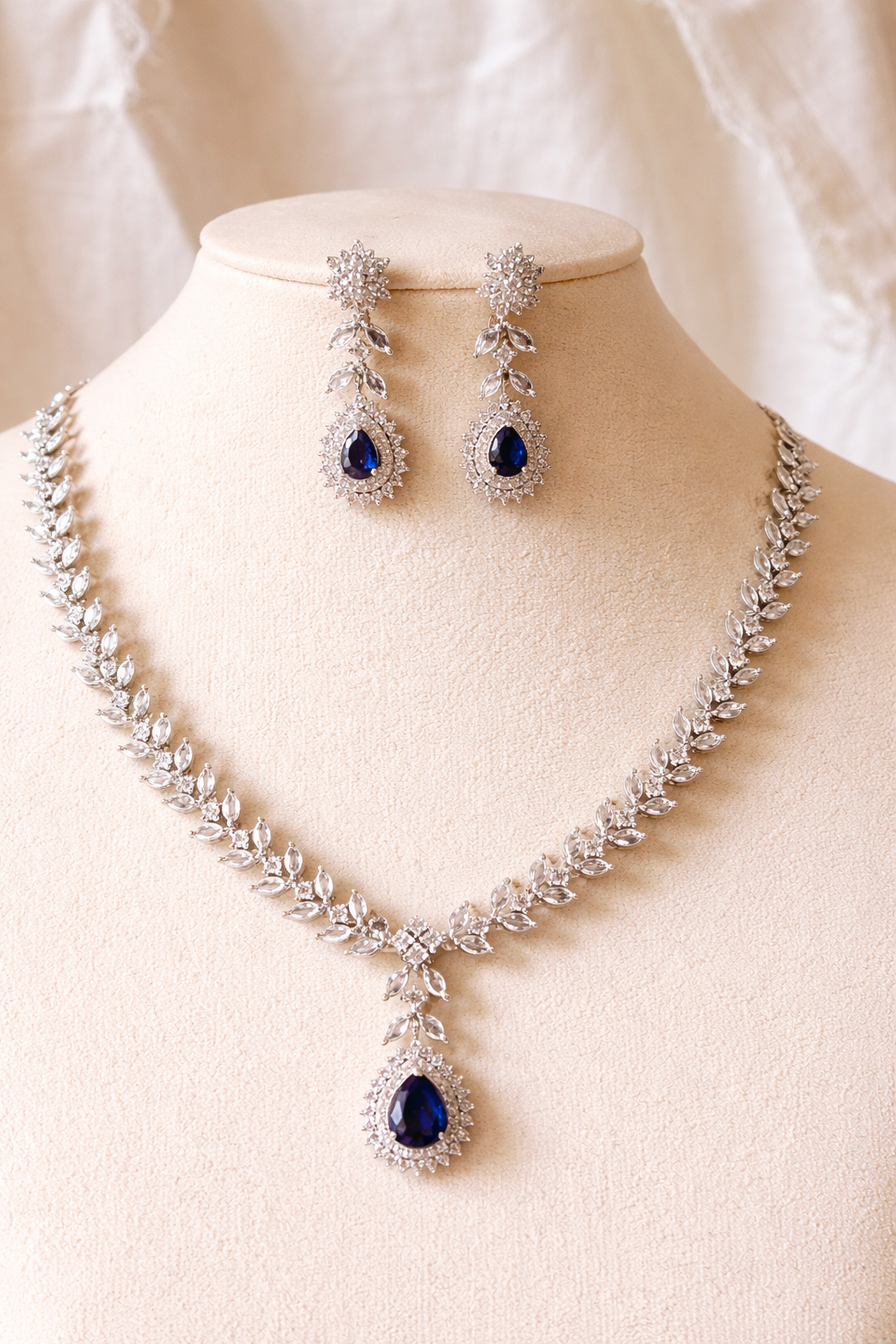 An exquisite diamond vine necklace adorned with a deep blue sapphire drop, paired with matching statement earrings. Crafted to reflect timeless luxury, this set is perfect for weddings, receptions, and grand evening occasions.