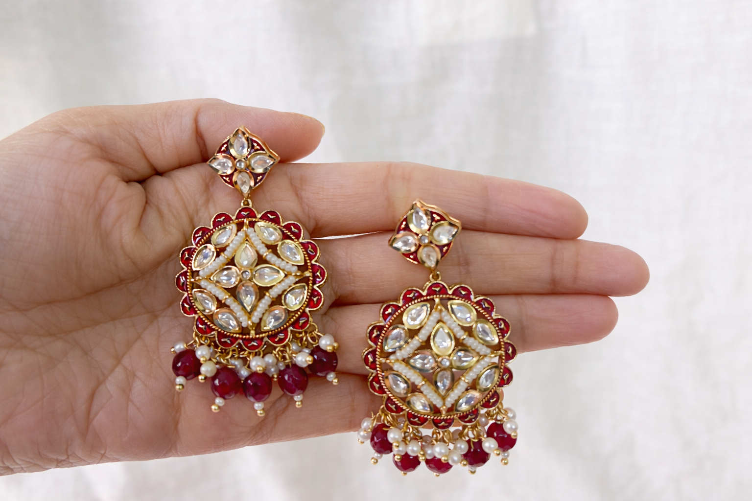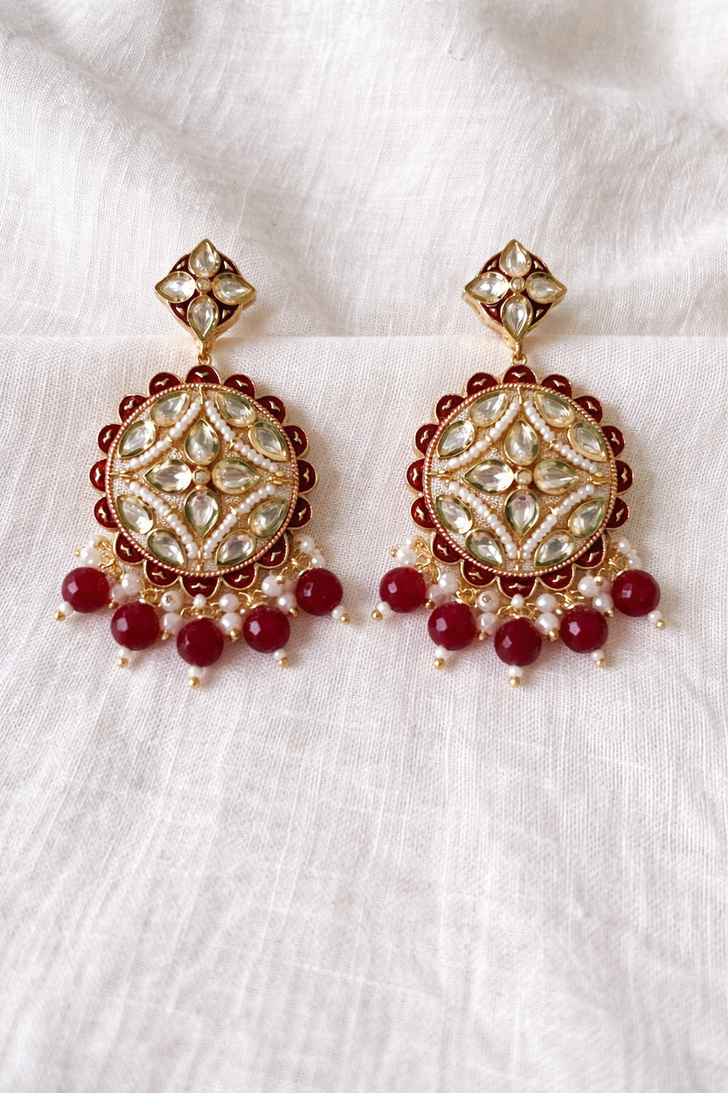 Elegant kundan drop earrings featuring intricate pearl detailing and rich ruby-red bead fringes, crafted in a perfectly symmetrical design—ideal for festive occasions and wedding celebrations.