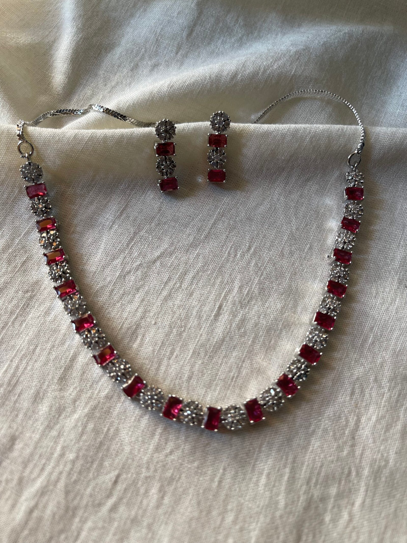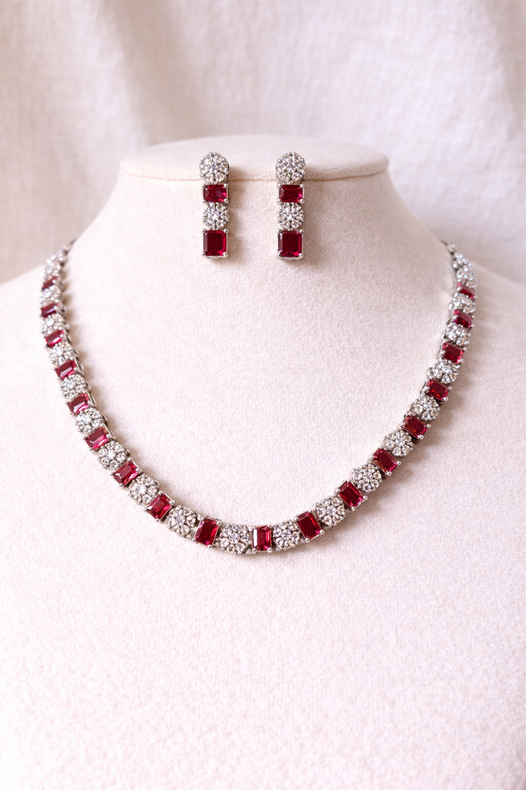 A refined necklace set featuring rich ruby-red rectangular stones alternated with sparkling diamond clusters, paired with matching drop earrings. Perfect for weddings, receptions, and timeless evening elegance.