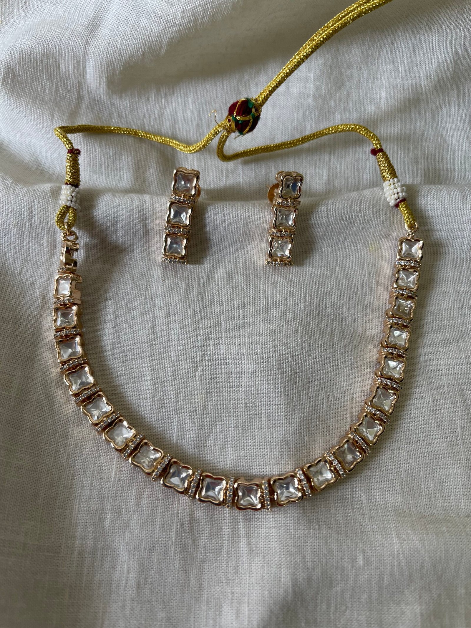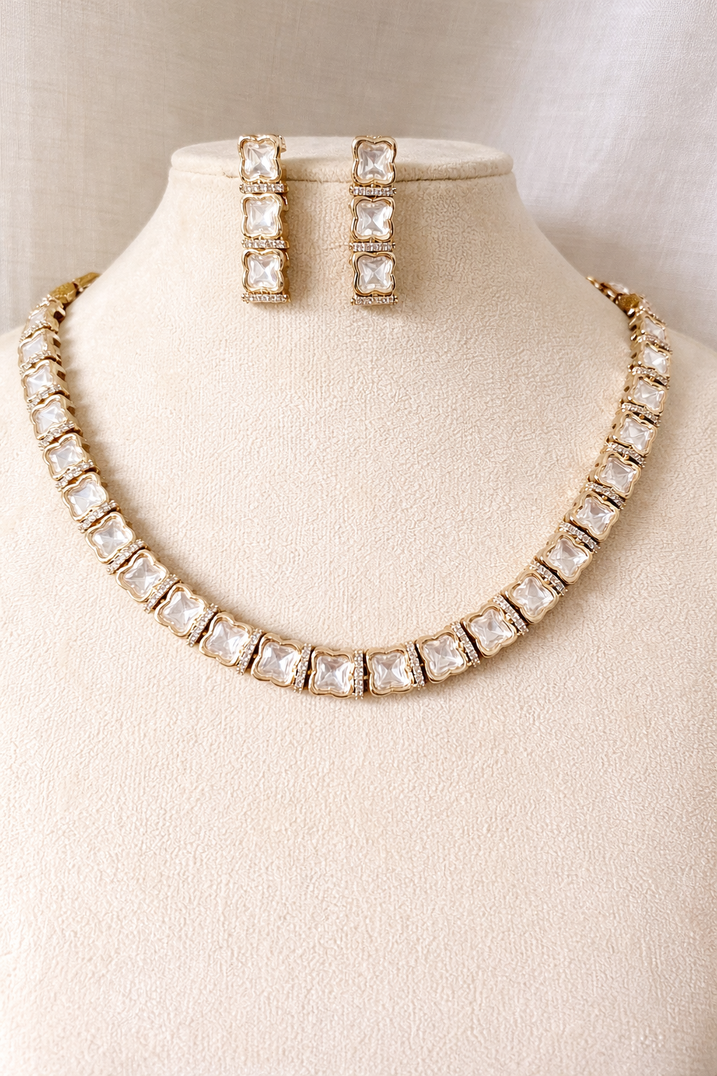 A refined and contemporary mossainite necklace set featuring perfectly aligned square-cut uncut stones framed in warm gold tones and accented with delicate diamond detailing.