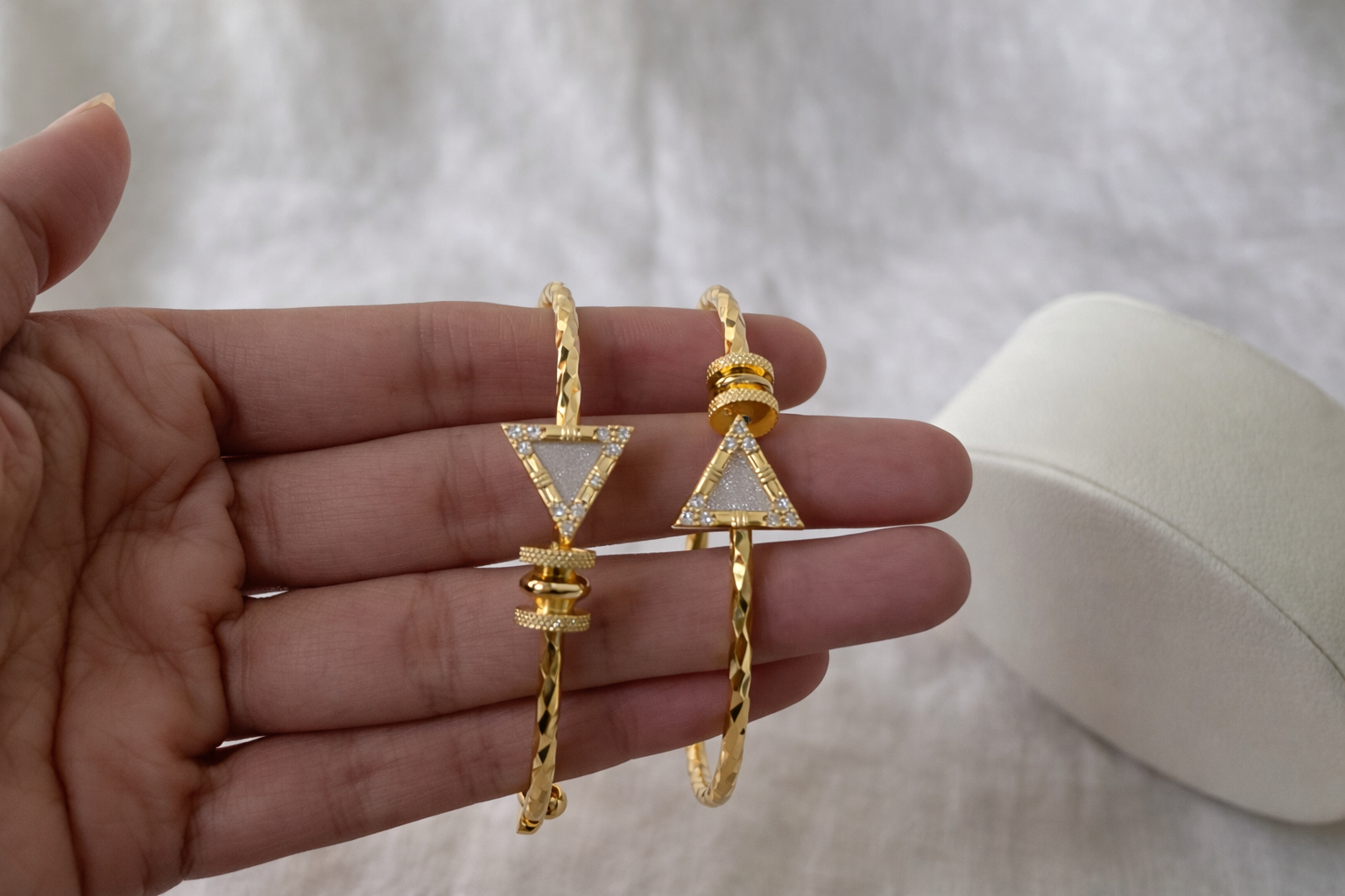 Modern gold-toned pairs accented with sleek triangular motifs highlighted by subtle sparkle. The geometric design paired with a textured finish creates a contemporary yet elegant look—perfect for those who love minimal statement jewellery for both everyday and occasion wear.