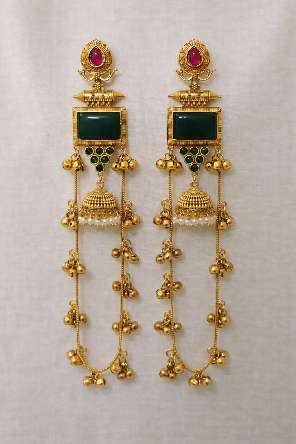 Classic temple-style long earrings crafted in antique gold finish, featuring deep green stones, ruby accents, traditional earrings, and cascading ghungroo chains for a rich South Indian heritage look.