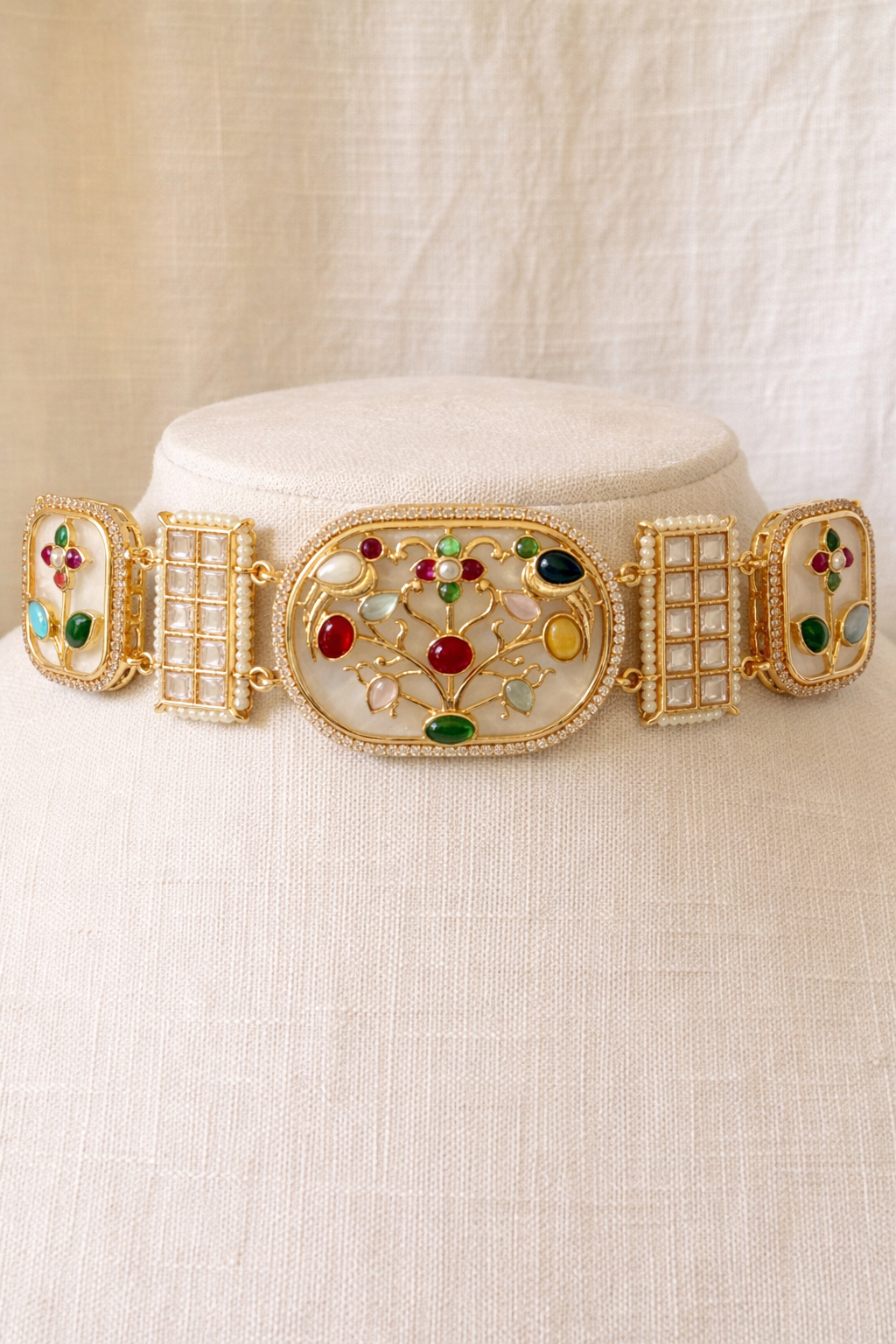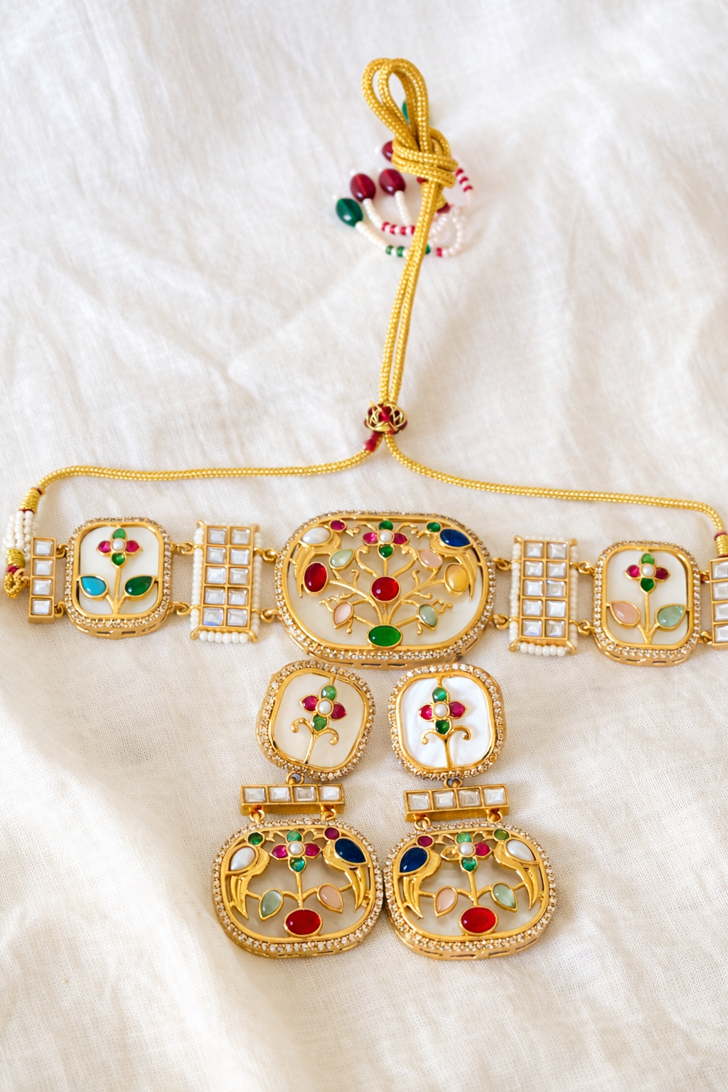 A graceful choker set inspired by the Tree of Life motif, adorned with multicolour stones, pearl accents, and delicate gold detailing for a regal yet refined look.