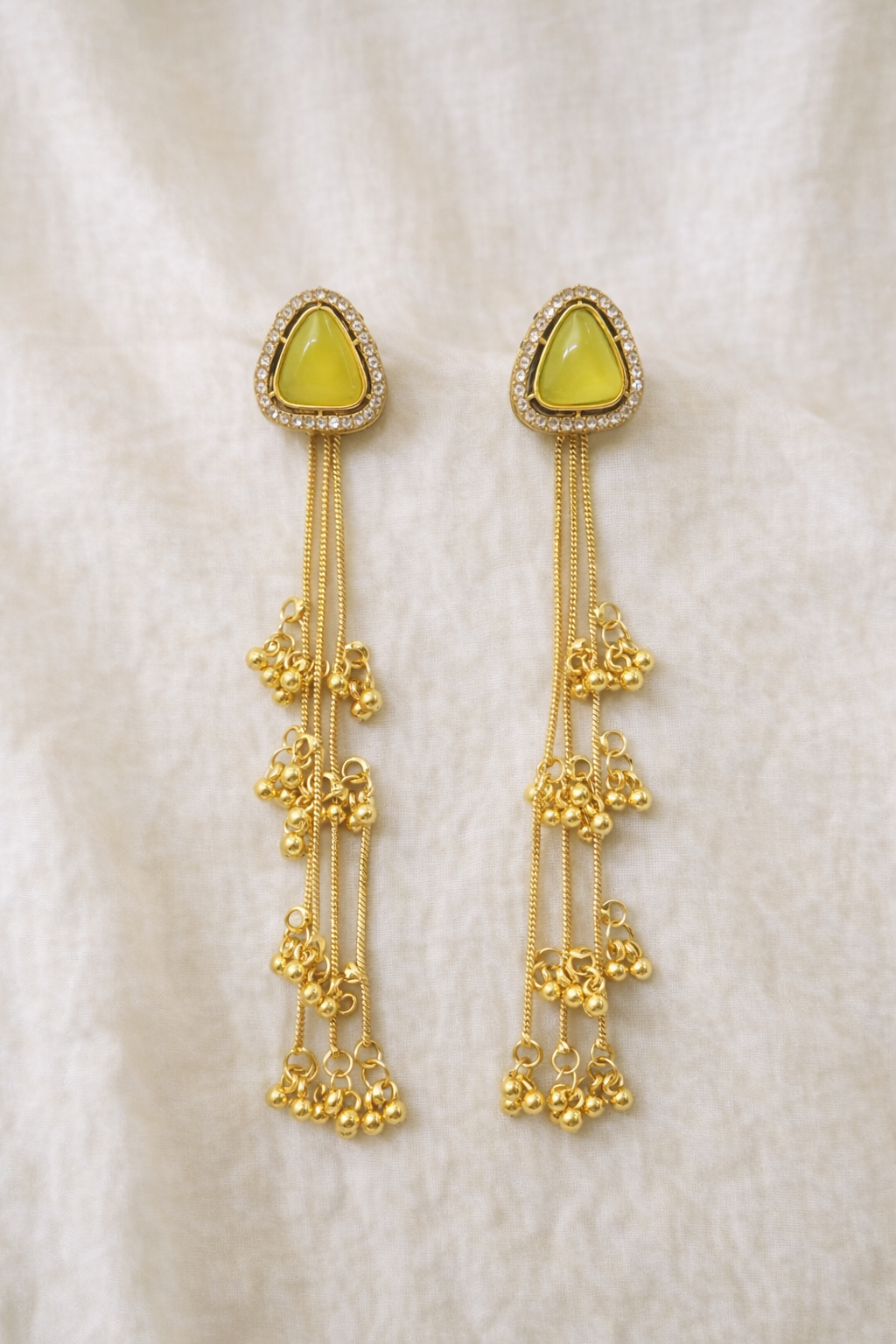 Graceful long tassel earrings with soft yellow stones edged in subtle sparkle and cascading gold bead chains—light, elegant, and perfect for festive or daytime ethnic wear.