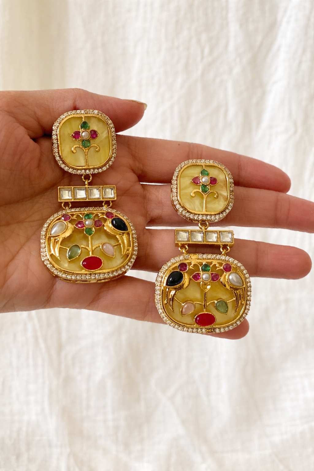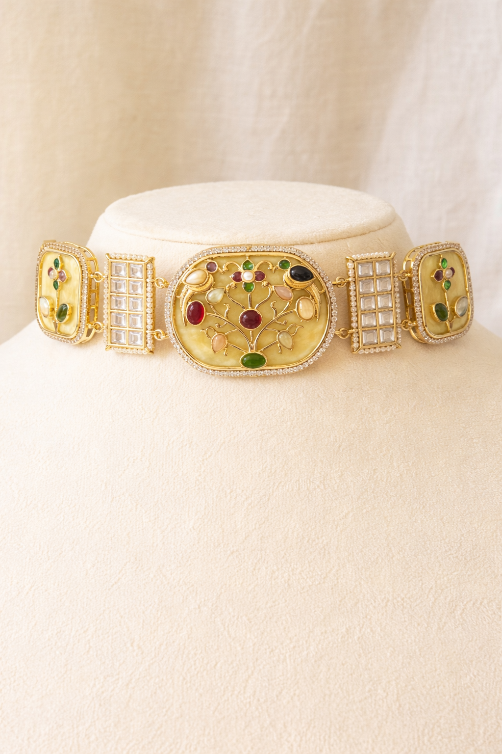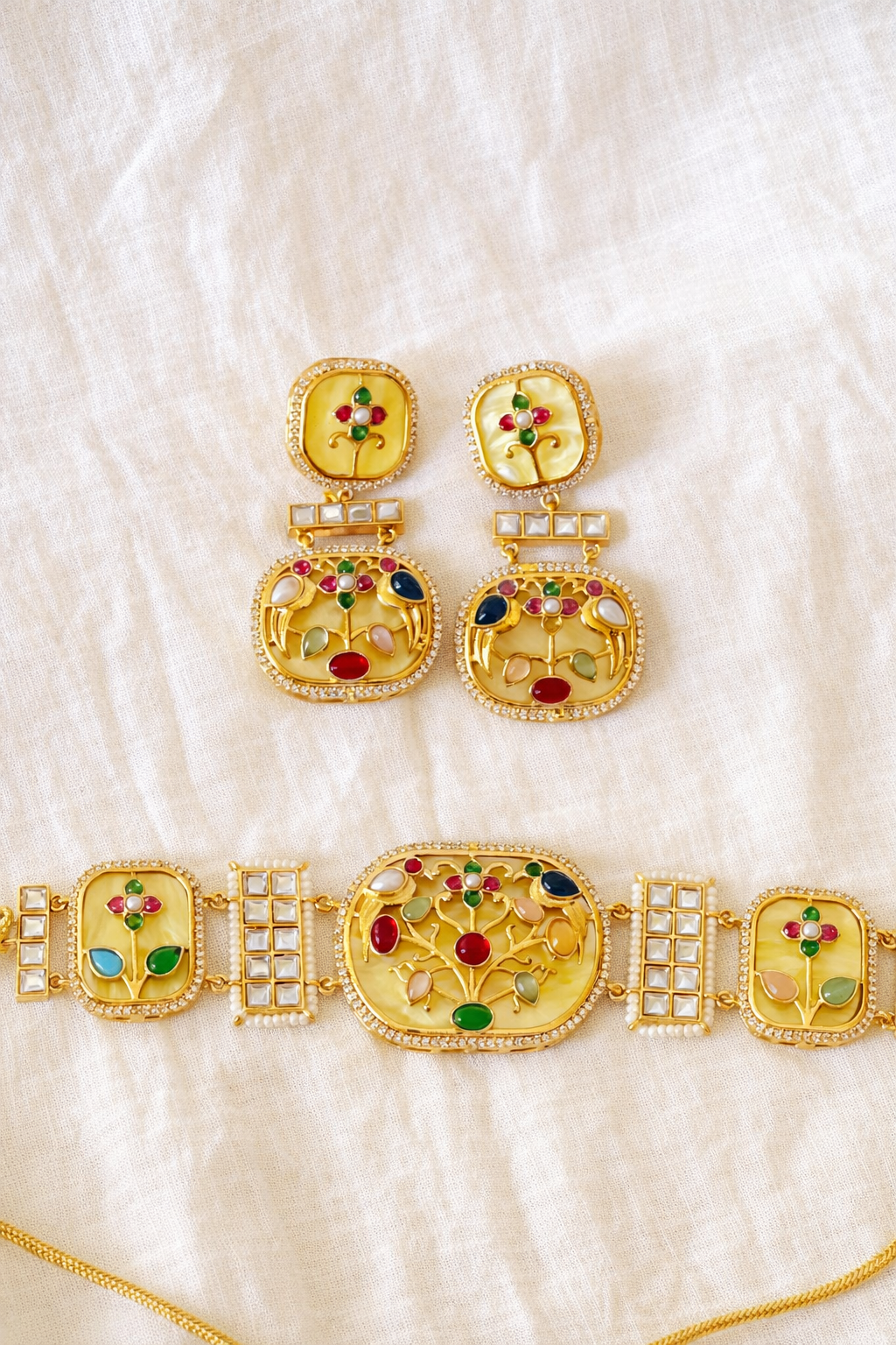 A vibrant polki-style choker set adorned with multicolour gemstones and delicate floral motifs, paired with matching statement earrings—perfect for festive occasions and elegant ethnic looks.